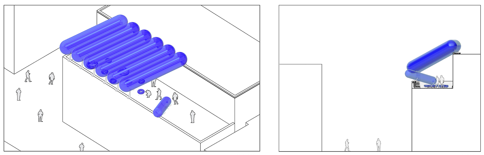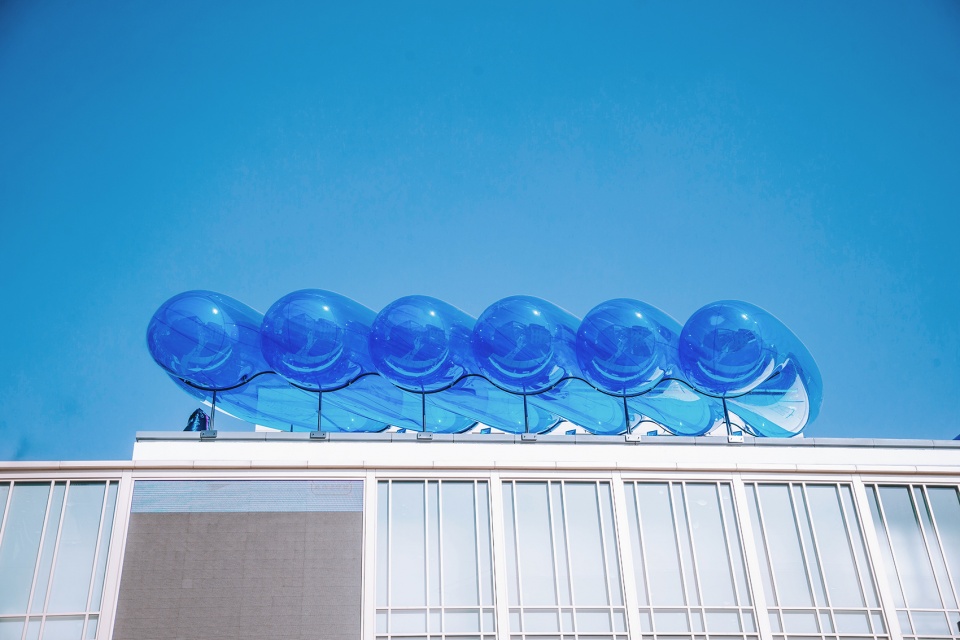 The Blue Sky Blues are situated on a roof terrace along Suzhou’s Guanqian Street. Through a group of blue transparent inflatables, a light and airy roof is formed over the terrace. The installation highlights China’s continued quest for more blue sky days throughout the country as it tackles air pollution, giving shape to this shared ambition. The sheltered space serves as a venue for parties, conferences and other events. The terrace area is also dotted with custom-made inflatable furniture, providing a playful seating arrangement as well as a restful place to sit and enjoy the view.