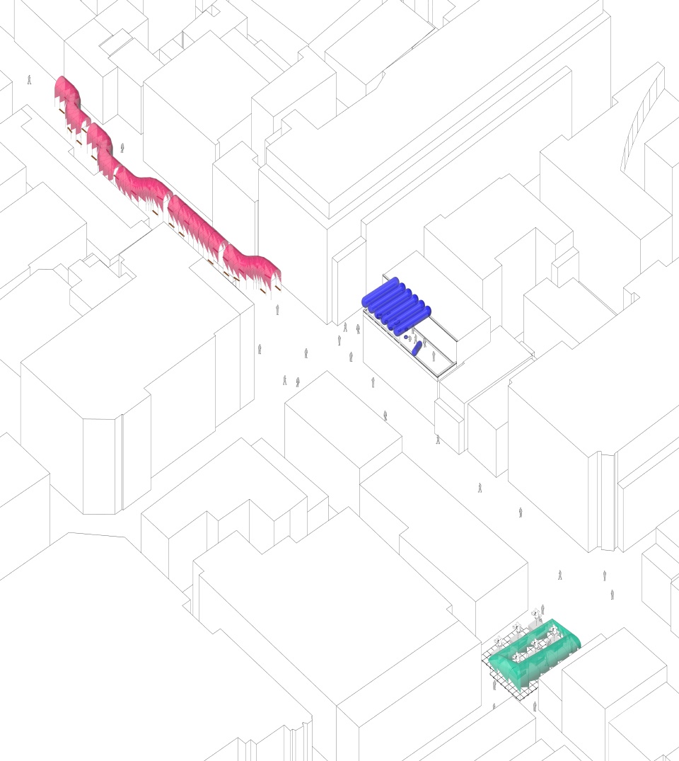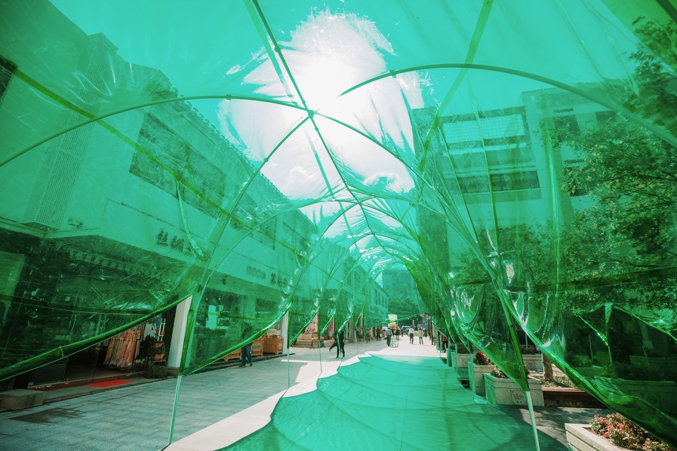 The Orbital Oasis forms a temporary stage and space for retreat amidst the bustle of Suzhou’s historic commercial district. The modular platform, and the circular walkway formed by intersecting arches covered with a green semi-transparent canopy, wraps around a group of six small trees, part of the existing plaza, providing both an open and introspective colorful space. Under the circular walkway light passes through the green film, creating a diffused atmosphere that changes the usual perception of Suzhou’s streetscape. The Orbital Oasis serves as a venue for performances, gatherings and activities, as well as a place to stop and rest under the trees.