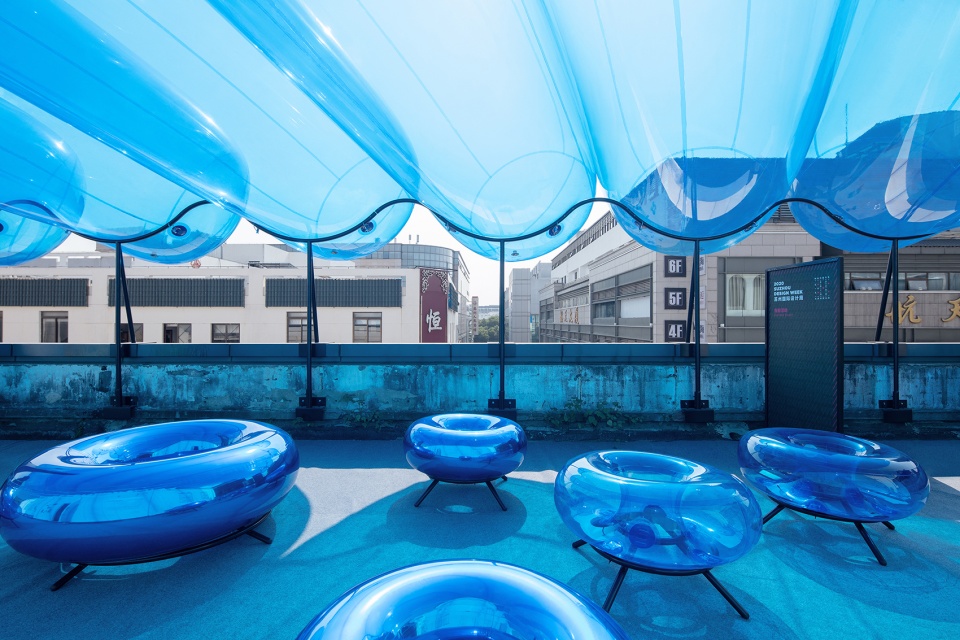 蓝天泡位于苏州观前街的屋顶露台上,通过一组蓝色透明的充气泡泡,在露台上形成一个轻盈通透的屋顶。蓝天泡作为一组装置也凸显了中国为拥有更多的蓝天所进行的空气污染治理的卓有成效,以及持续治理的共同目标。 屋顶下的露台空间作为聚会、会议和其他活动的场所,点缀着不同形态的蓝色定制充气家具,提供了一个有趣的休息空间,在这可以悠闲地坐下来欣赏周围的美景。