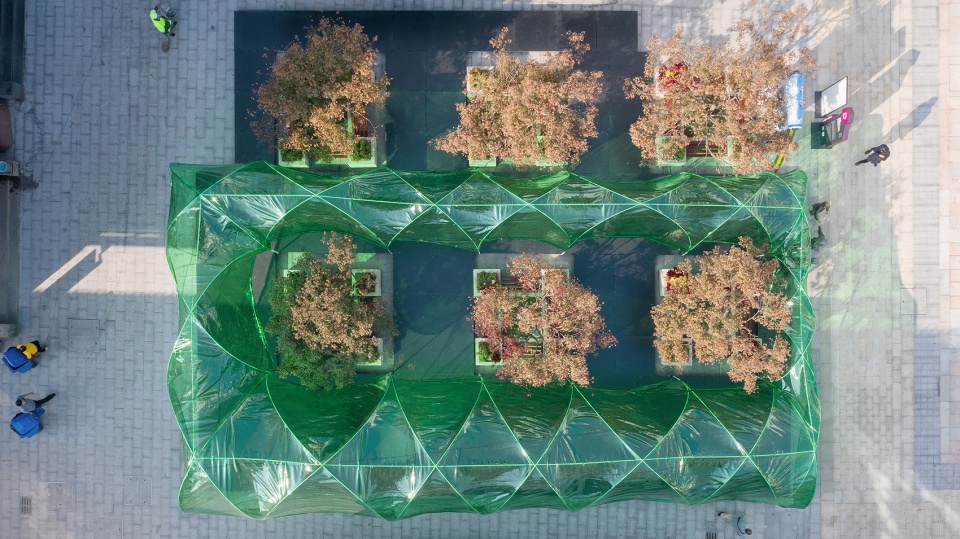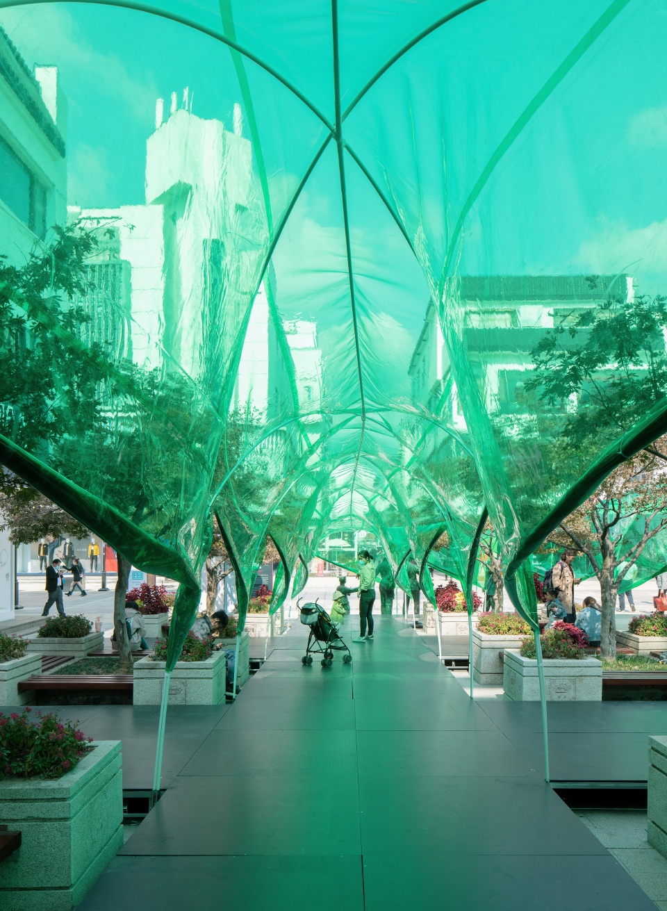 绿洲廊是在苏州历史悠久、喧闹的商业街中创造的一个临时舞台,也是一个临时隐居所。 模块化平台以及覆盖着绿色透明膜的交叉拱拱廊,形成回字形布局,围绕着广场原有的六棵小树,提供了既开放又内向的炫彩空间。在回廊内,光线透过绿色薄膜营造出迷离的氛围,改变了苏州街道景观的常态观感。 绿洲廊是表演、聚会和活动的场所,也可以作为在树下休息的空间。设计围合了现有的露天广场,在形成新的街景的同时,创造出一个具有吸引力的非常规舞台空间。