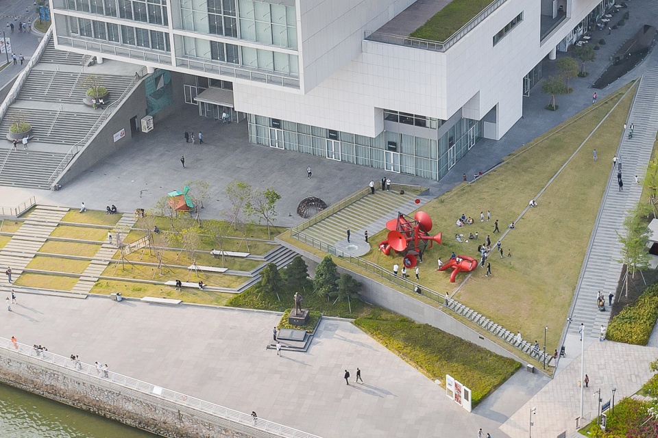 “社交厂”的大喇叭们伸向四面八方,与桢文彦(Fumihiko Maki)设计的展馆悬挑体块遥相呼应。 桢文彦的设计将视野引向远处的风景,而“社交厂”的喇叭们则将声音与视觉投射到紧邻的区域,如海滨长廊、花园,及文化艺术中心的入口。