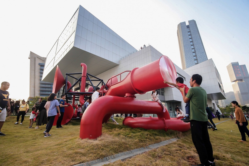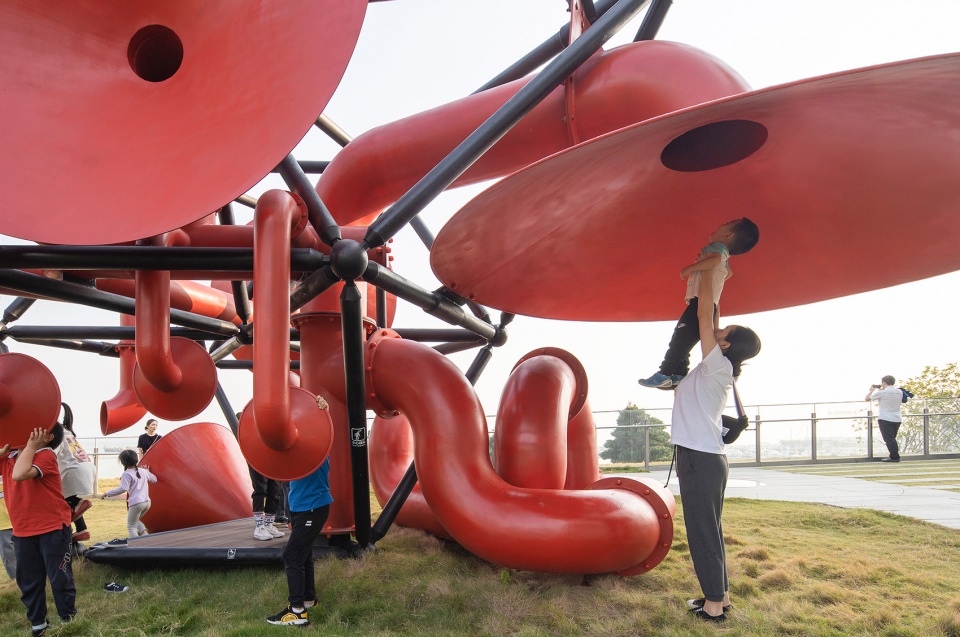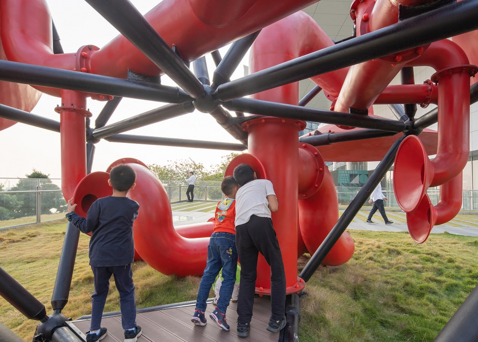 An art installation that activates public space, the Social Network Factory is located on the grounds of The Sea World Culture and Arts Center in Shekou, Shenzhen. The entire installation is about six meters high and consists of four sets of surrounding “pipe horns” intertwined in a spatial grid.