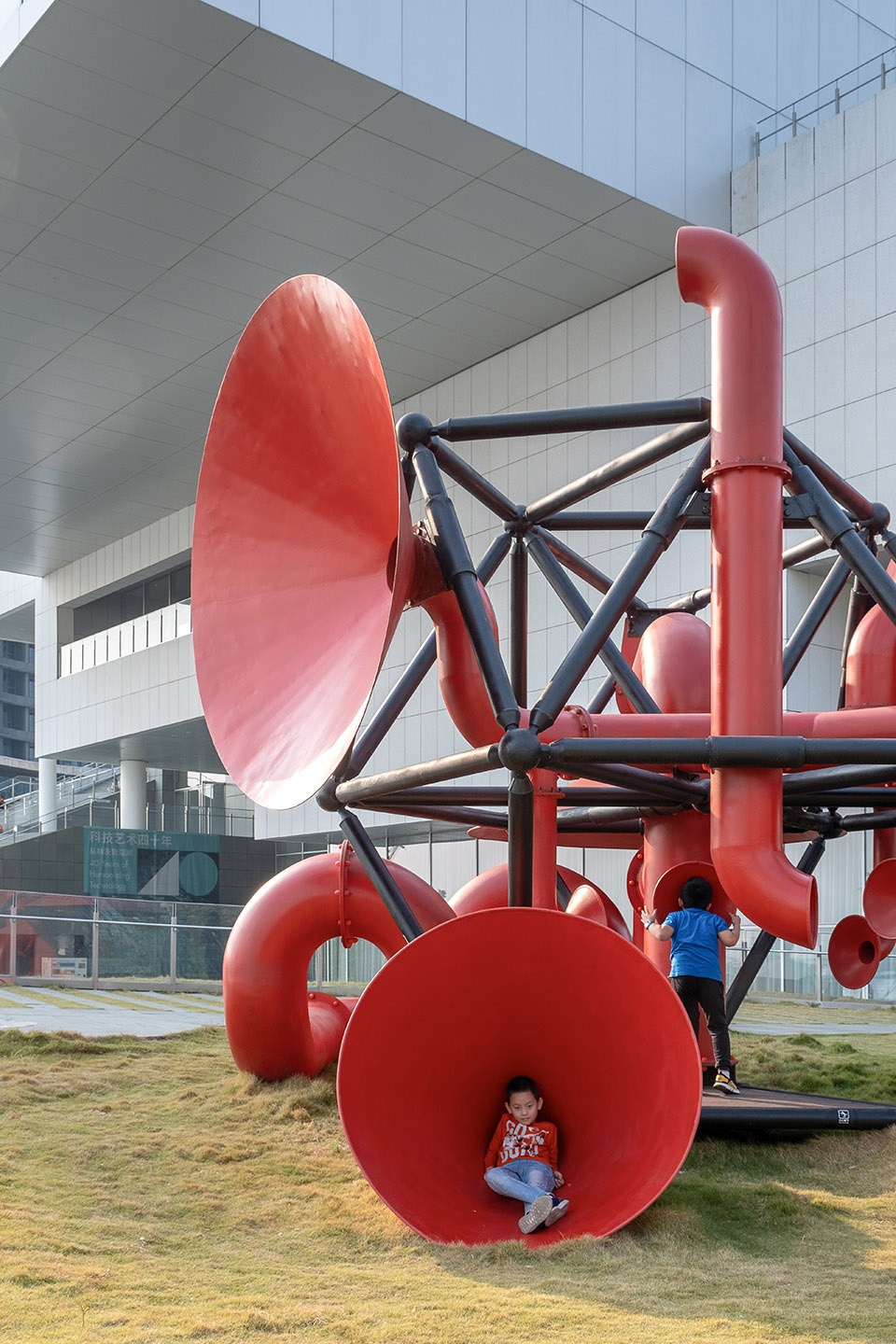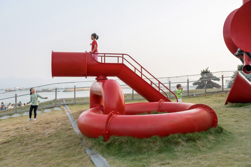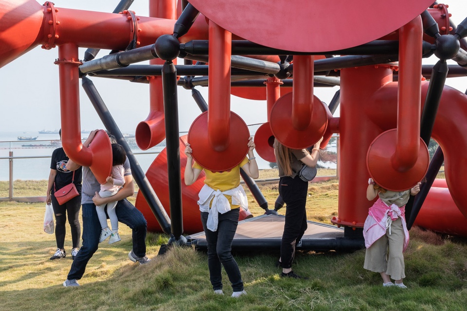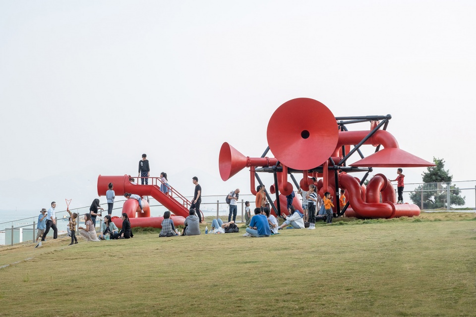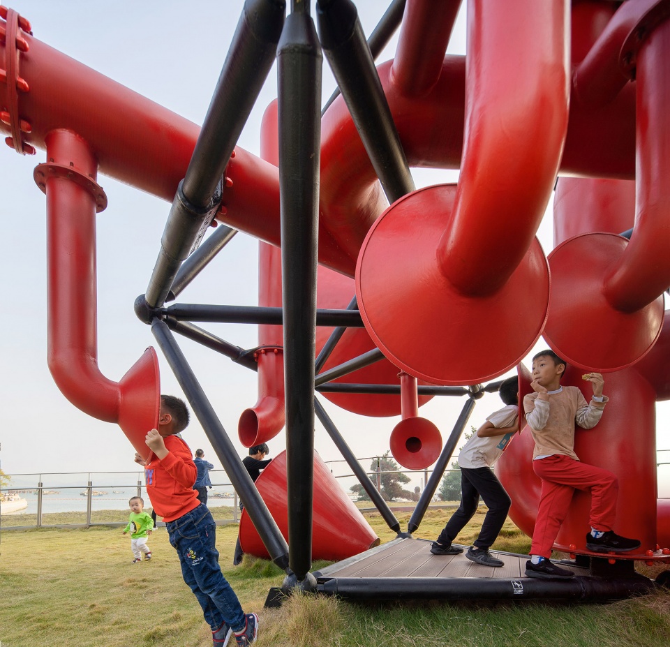 Functioning on a human scale, small horns allow people to speak indirectly to each other while large horns are occupiable and provide cover for social activities. The installation’s twisting tubes recall the maritime and industrial heritage of Shekou. They become telescopes, periscopes, and public furniture that facilitate the gathering of people.