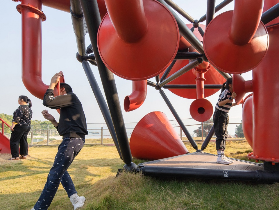 喇叭的设计促生了不同的活动,如小喇叭让人们彼此隔管交谈,喃喃细语,或放声呐喊都可。向下的大喇叭则界定了一个场所的边界,为社交活动提供庇护;交错缠绕的管道使人联想起蛇口的航运工业遗产,它们同时也是望远镜、潜望镜和城市家具,便于人们在此相聚。