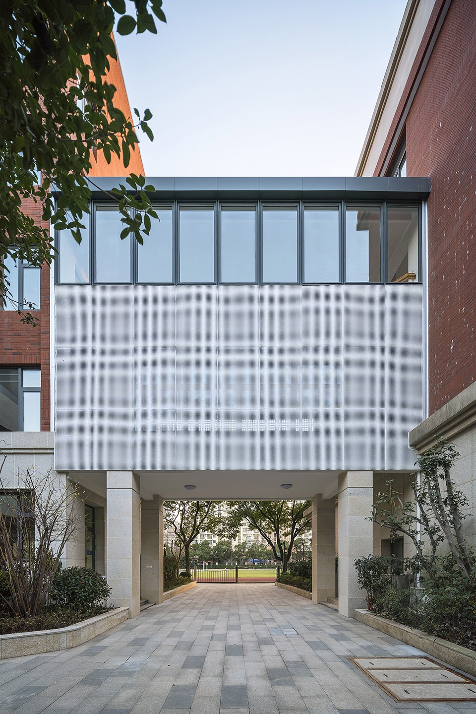 The corridor connecting Danhua Building and Boxue Building is an important traffic node in the school, which satisfies the efficient connection between the teaching buildings; but the simple curved sun roof that was originally built is not only leaking, but also dusty, largely diminishing the practicability and the appearance. Therefore, we changed the form of the original roof by re-arranging the drainage and adding sound insulation materials to the suspended ceiling for noise reduction; given the overall facade effect of the campus, the white perforated panel is attached to the outside, connecting the two teaching buildings with light “rhythm”.