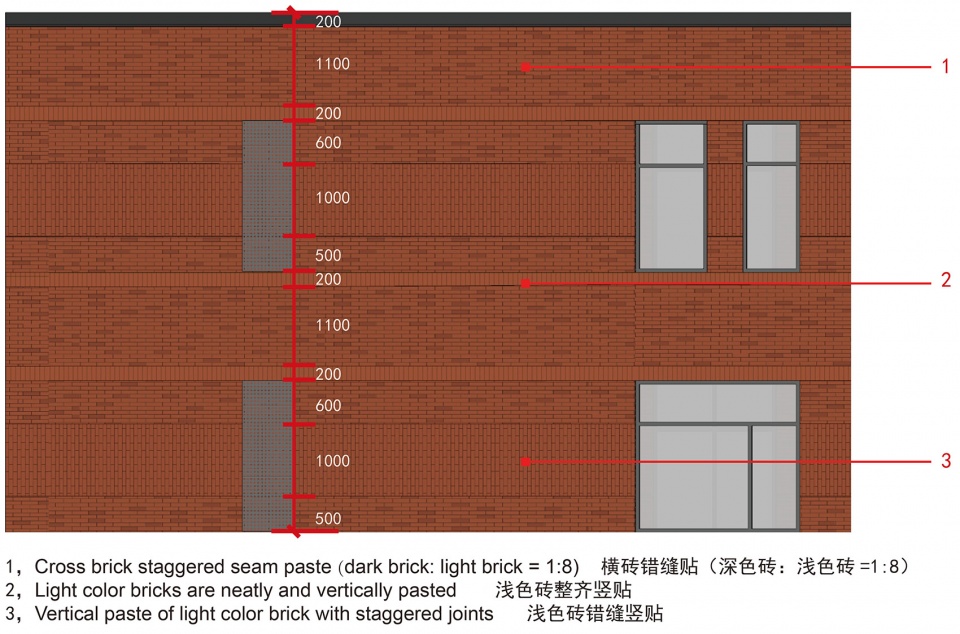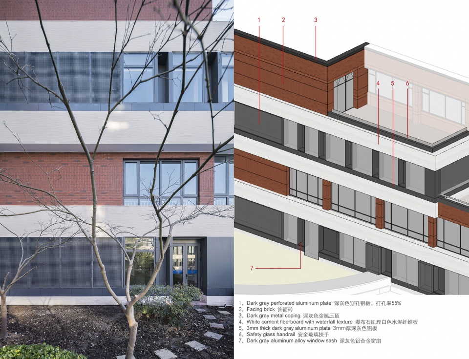 ▼多材料在南立面表现红砖的肌理,Multi-materials expressing the red-brick texture on the south facade