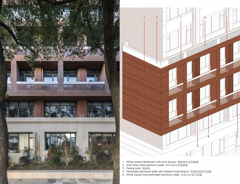 There are two main types of cement fiberboard applied to the project. One is the white fiberboard mimicking stone block texture, which is applied to the east and north facades; and the other is the red fiberboard mimicking brick texture, which is applied to the south facade. In addition, we hide many air-conditioning pipelines and downspouts originally exposed outside in the spaces required for fiberboard keel structure installation. Such material is with the appearance similar to traditional masonry materials (stone or face tile) but is lighter in weight.