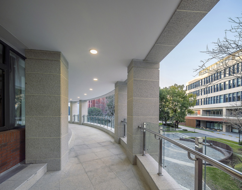Considering that there was only a simple glass canopy at the entrance of the original teaching building, lacking sense of ceremony with toneless spatial form, therefore, a double-layer colonnade is built. On the first floor of the colonnade, there are two areas for public activities. A free activity platform is set up on the second floor because we want to open a space for students to sit and talk joyfully while introducing more landscapes into the teaching building.