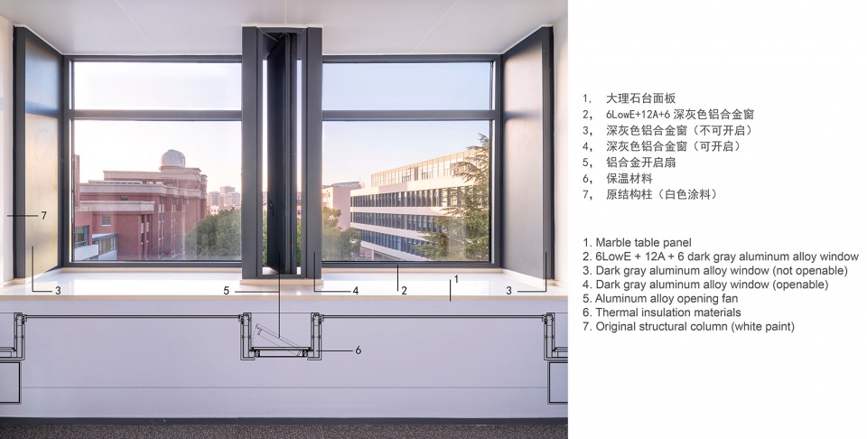 In the design process, while retaining the structural system of the original teaching building, we added bay windows to improve the monotonous linear space of the original corridor and increase the possibility of students and faculty members communicating with each other; the combination of aluminum alloy windows frame with enlarged viewing window contributes to more campus views and warm sunshine into the building. The long-standing terrazzo floor tiles were also preserved and protected to the greatest extent during construction to tell people the past and glories of the building.