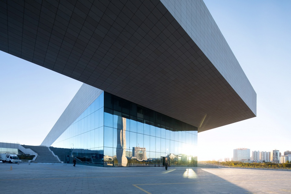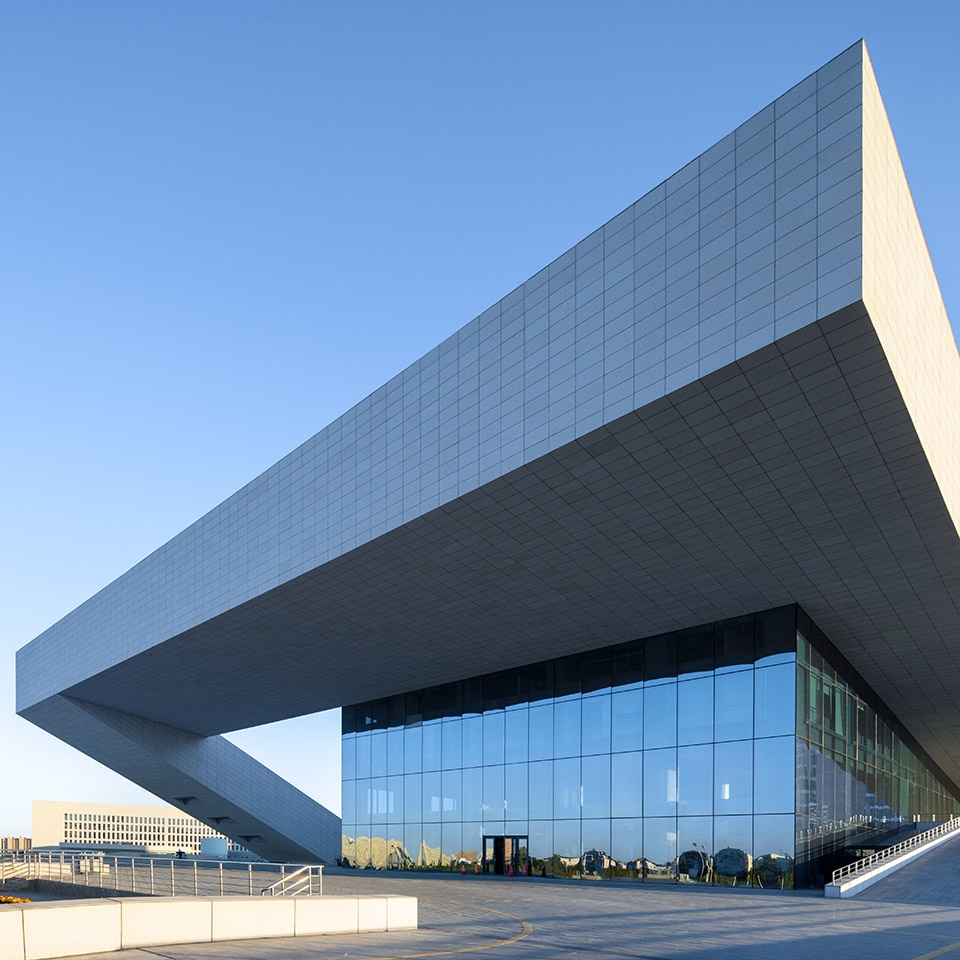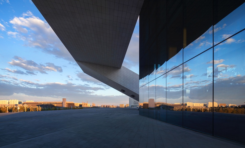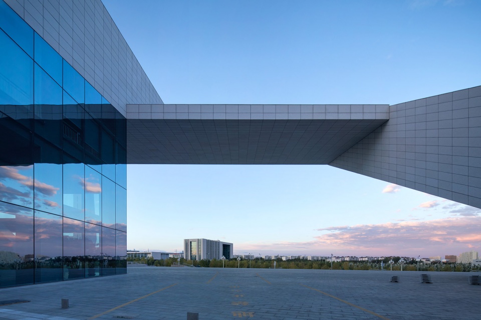 The data network control center took the design concept of “an ark floating on the wavy dunes of the Gobi Desert”, in a dynamic geometric form that symbolizes a ship’s bow rising from tides. The concept is articulated through a set of modern design languages. The entrance space framed by a 30m cantilevered steel structure and horizontal steps creates an imposing spatial experience. Its bold figure reshapes the skyline of the Karamay oil field’s administrative area. The façade is composed of warm grey aluminum honeycomb panels to emphasize solid massing in contrast with the foyer’s large glass wall. To balance the visual heaviness of the upper part of the building, the floor and entrance steps are tiled with dark stone. Viewed from a distance, the center’s volume conveys a sense of momentum and vigor.