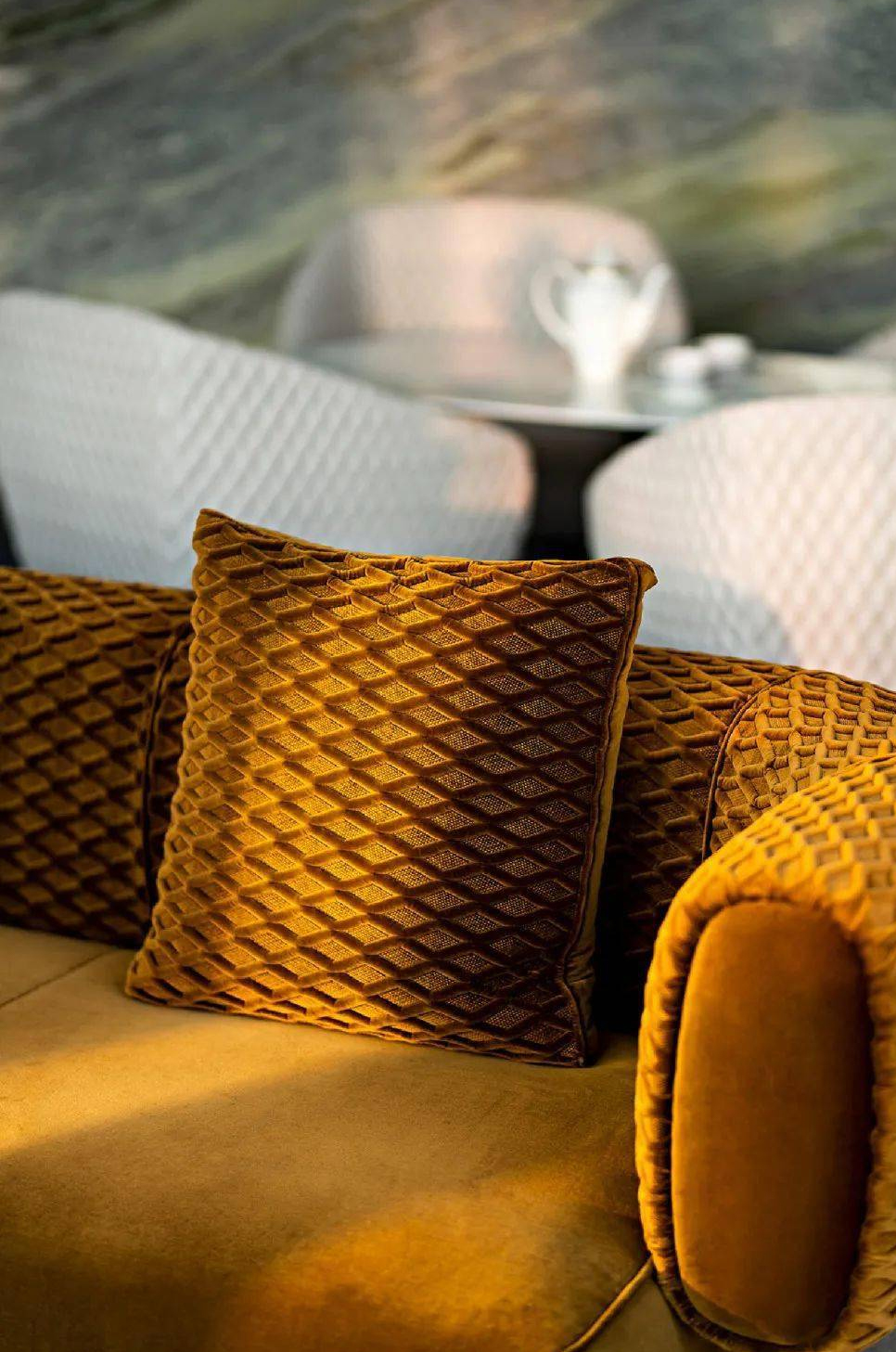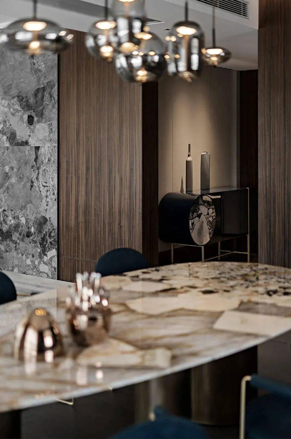 空间墙身甄选乌檀木作为饰面,附以设计之语,沙发背的利奥灰石材带来自然水墨纹理,散发尊贵与时尚的静雅,舒适的沙发色调与背景墙相映成趣,大气之外,尽显非凡品位,此间生活品质可窥一二。