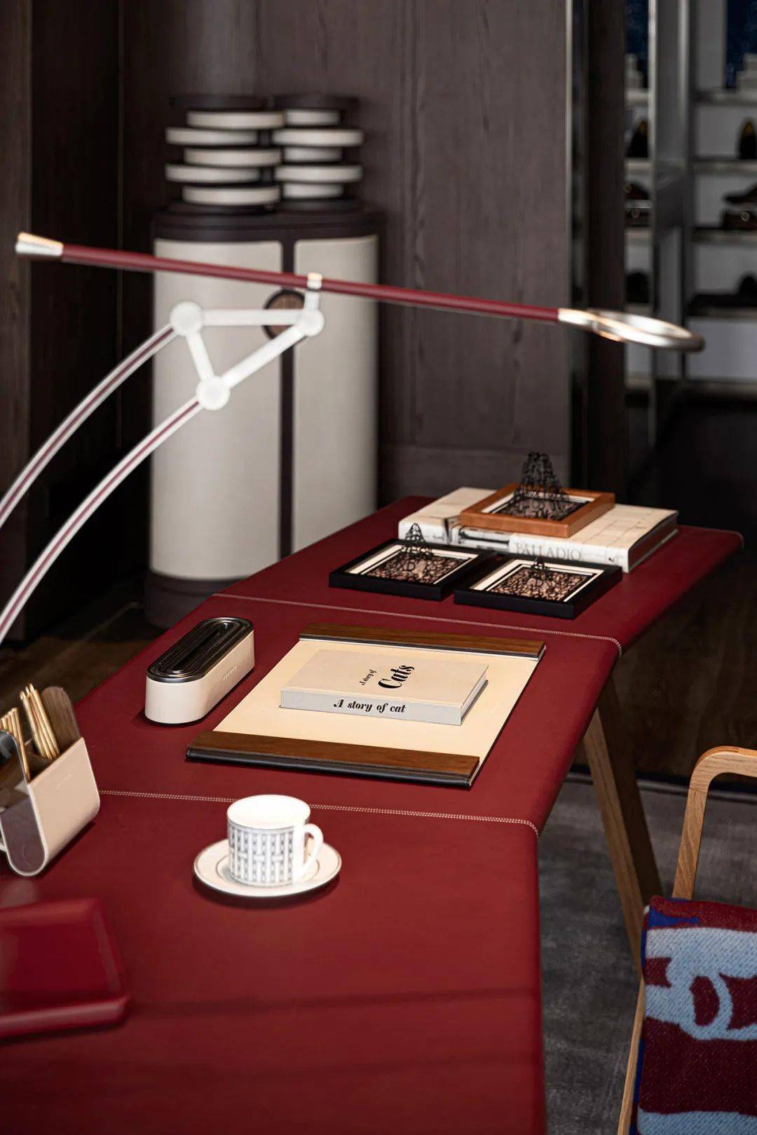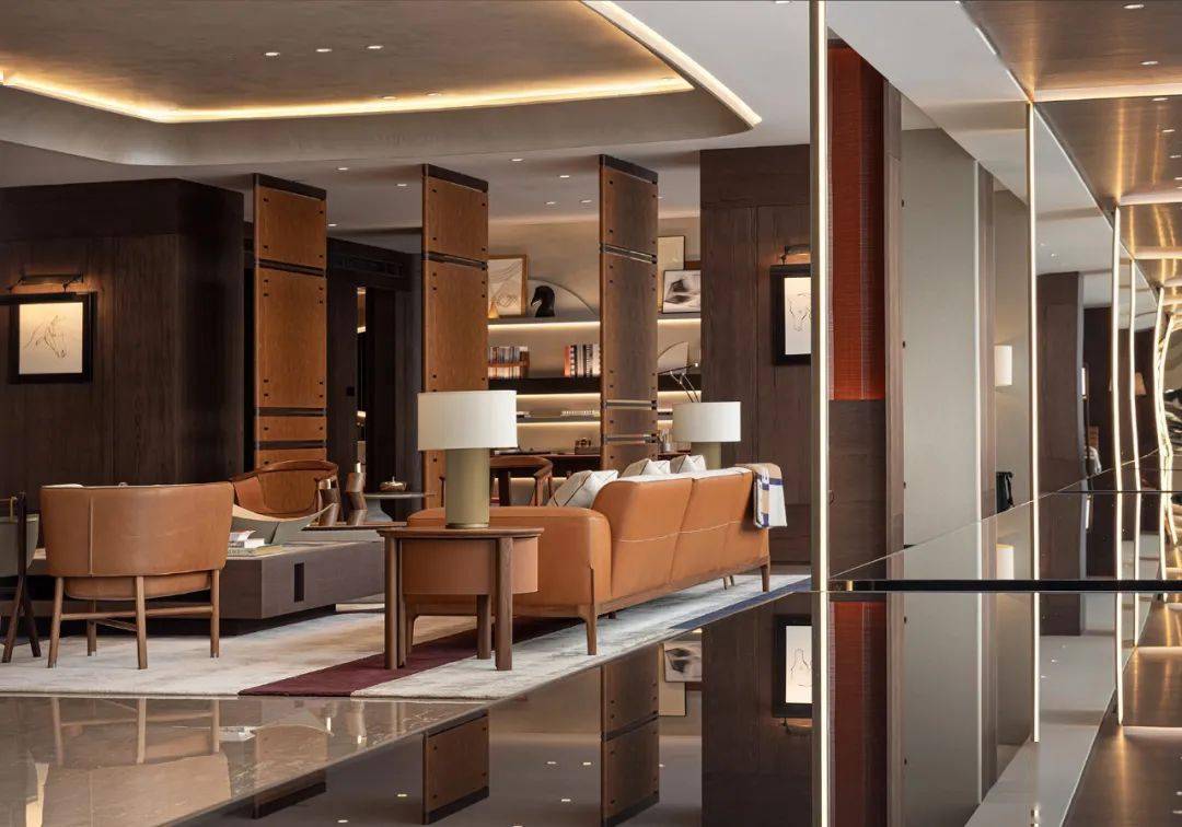 环顾一侧,长达九米的艺术展示柜令人惊叹,致敬著名建筑师阪茂为 Hermès 的创作。皮革、木材与古铜创意重组,无尽优雅与艺术体验尽收眼底,展柜融入丝带与马鞍元素,每层体现菁英生活方式不同面,将奢级优雅,与国际时尚的大气,镌刻于一室之内。