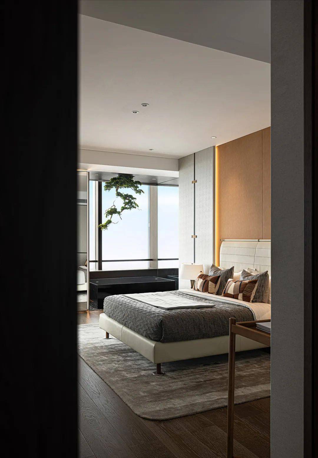 长辈房中一抹倒立悬松,取“四季常青”、"时光逆龄”之意,在卧室水景映照下,不同角度欣赏,别有趣味,环顾室内,米色温雅低调,更是长者风范,宽敞落地窗,极致采光令长辈精神愉悦。