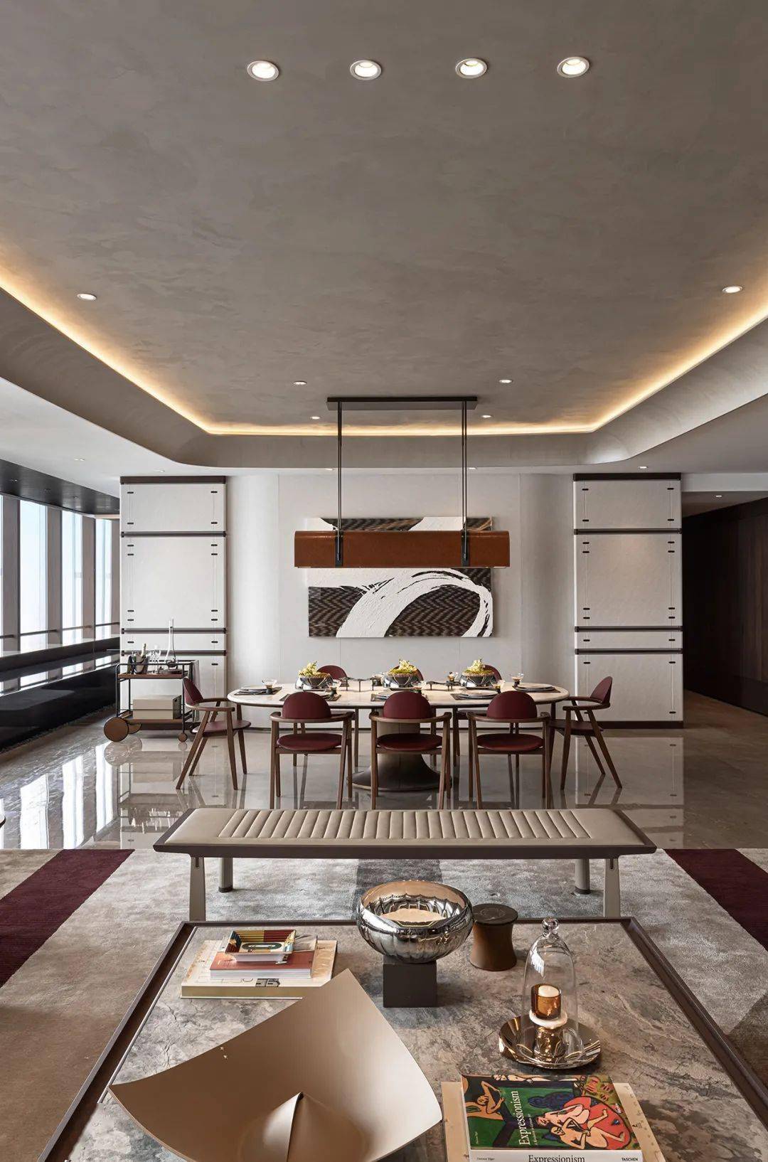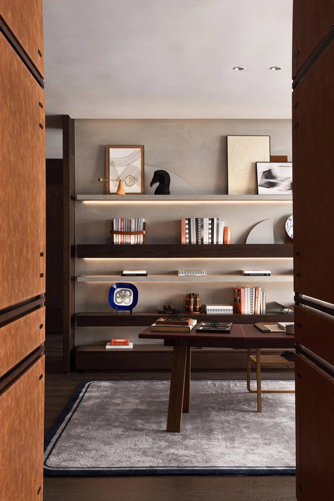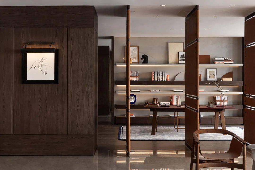 客餐厅侧首与书房相连。屏风门采用传统中式木工元素,结合 Kelly 包经典压扣设计,细节之处精致典雅,触之难忘,一睹斐然,四扇屏风门可开可闭,为沉浸空间趣味加码,合则如空间内壁,品味尽显,开则风度四溢,彰显居者威严。