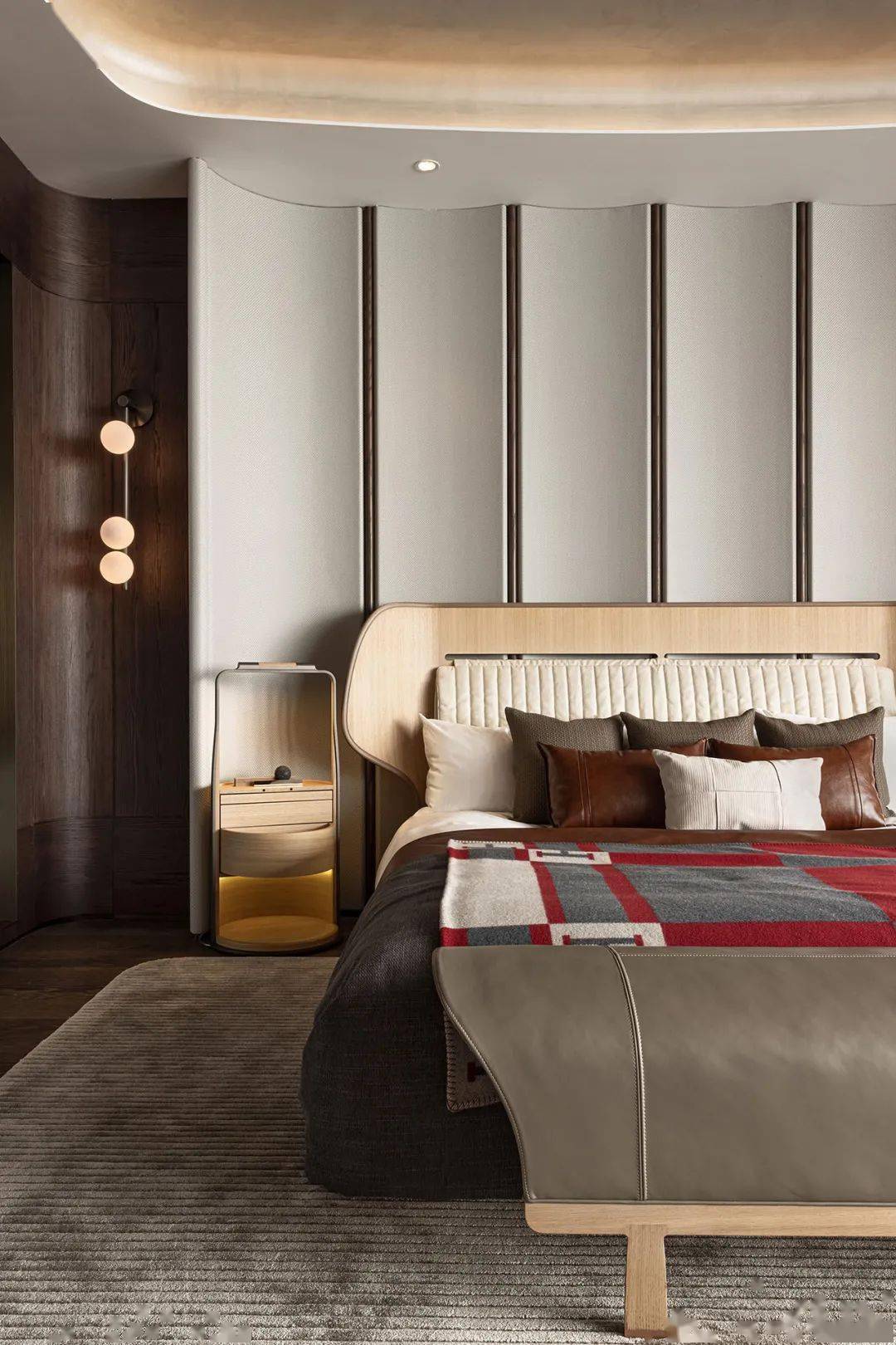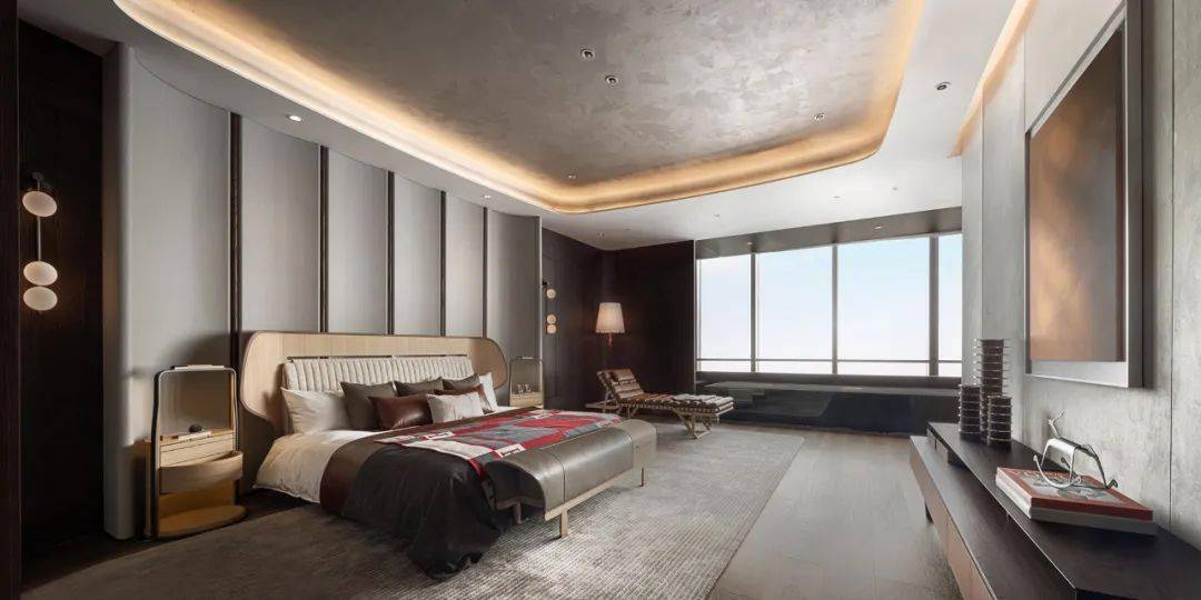 卧室中的细节不仅完美点题,更具舒适安然,吊顶、床凳与背景墙亦可寻觅“马鞍”之弧,弧度既是优雅之姿,亦如“环抱”之意,使人不禁卸下压力,与真挚自我拥抱享眠。