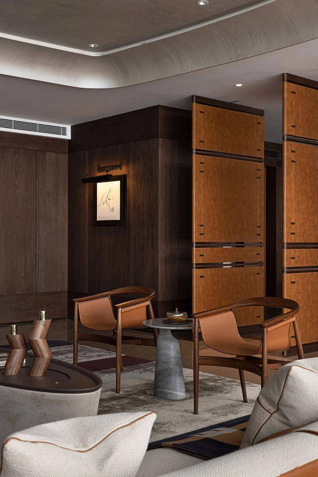 背景墙以编制皮革镶嵌圆弧细实木条,层次分明,·创造出细腻韵律,规避全皮风格的单调,又展现材质质感,更加温和精致,也令视觉有了节奏的跳跃。静卧于床,眼前是精选挂画陈列,将房间内艺术氛围升华,令身心在此休憩,一同安宁坦然。