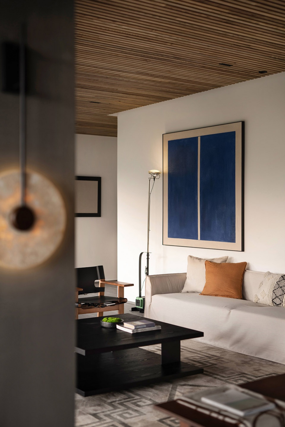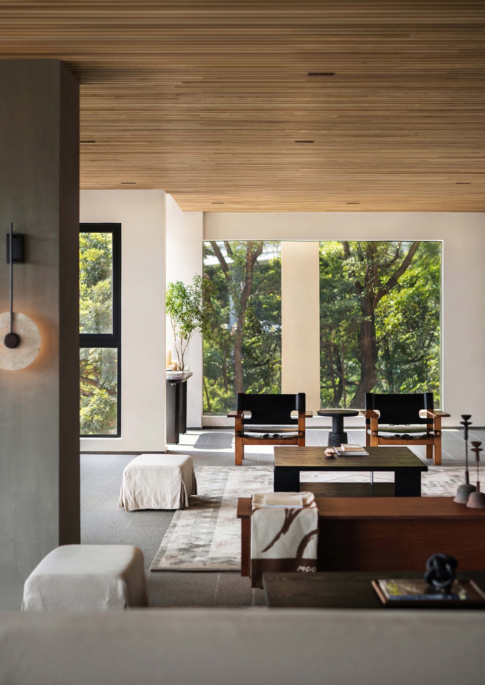 作为森系的空间体系之一,拥有相同繁茂的山野绿意,设计考虑以更简洁清浅的当代语言为空间营造松弛的感受。家具的选型及色彩的考量平衡了室内外的关系,空间不仅让人慢下来,而是带着思考驻留。局部蓝色点缀巧妙呼应更为年轻态的生活方式,与当下焦虑的都市快节奏形成碰撞,并引发共鸣,赋予空间更多维的社交感受。