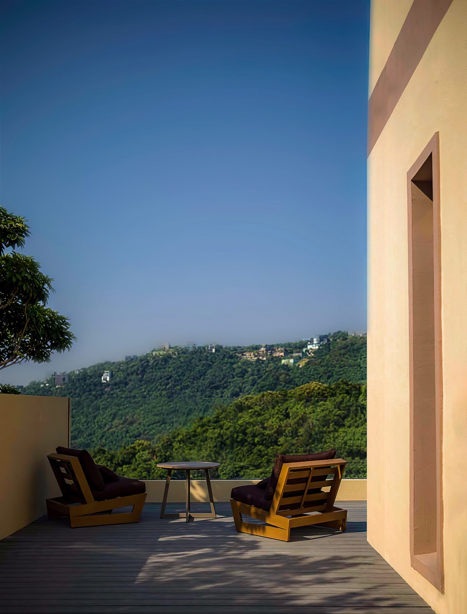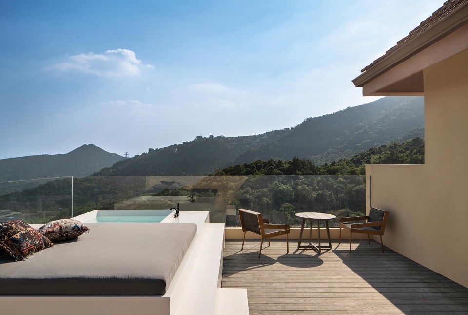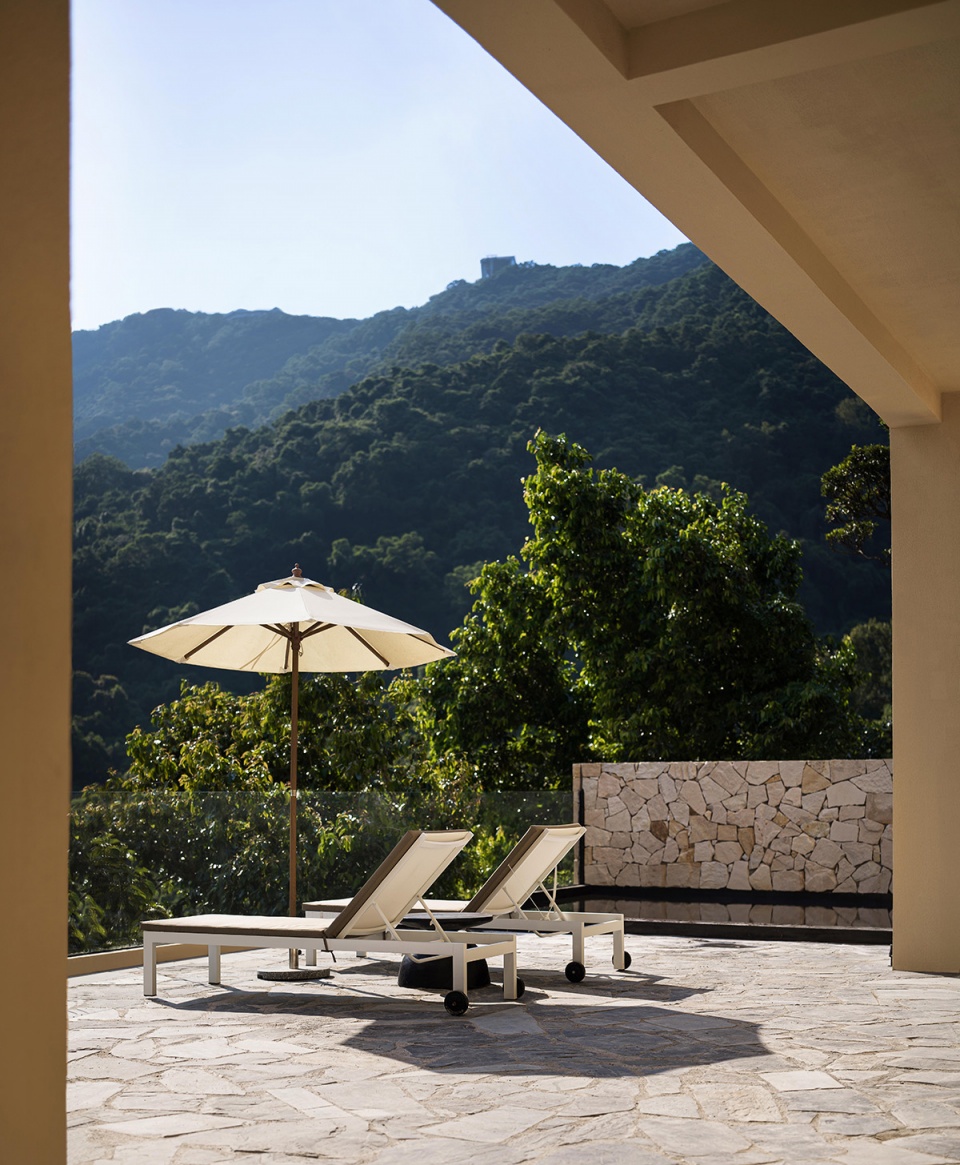 在天麓的蜜悦,静谧的生活总与深度的精神内容无法分割。露天的泡池,将日常的生活与精神的高远交织于一体。设计希望通过朴素的材料和干练的结构,将山林的安静与海的辽阔融入空间感受,让入住者能更直观的体会自然与人的关系,在日常中感受到与城市的差异。