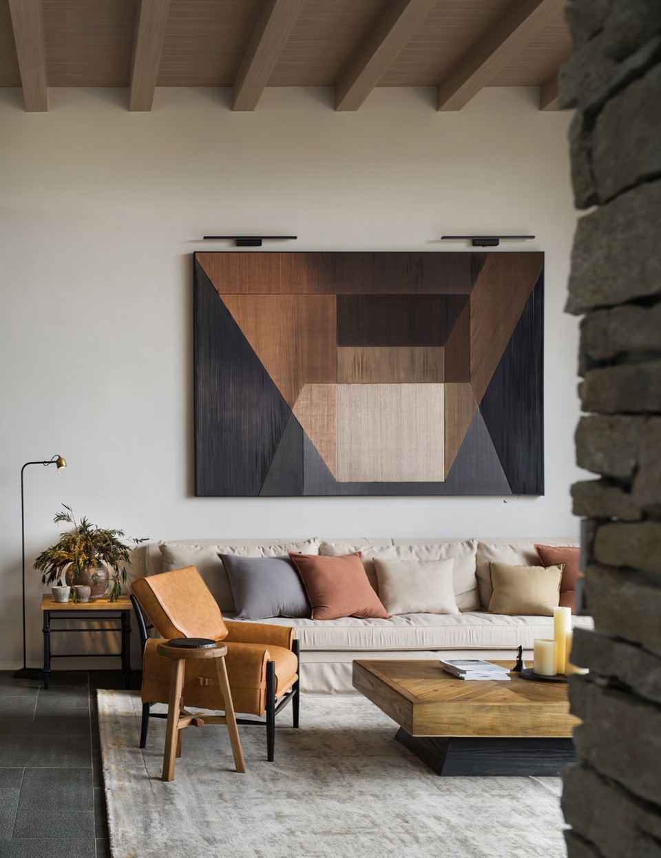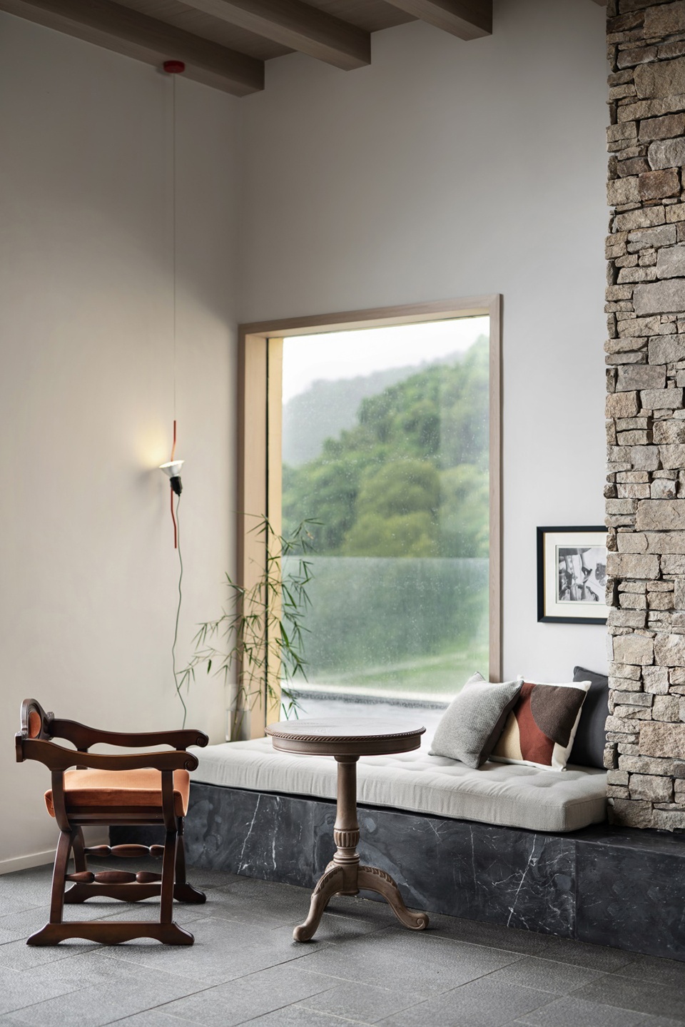 空间以具象的叙事手法将自然生态引入室内,朴实的原石肌理背景结合中古家居的极简形态,形成一个轻松的情绪聚合场,在“现实与理想重叠”中生长出一种新的生活形态。