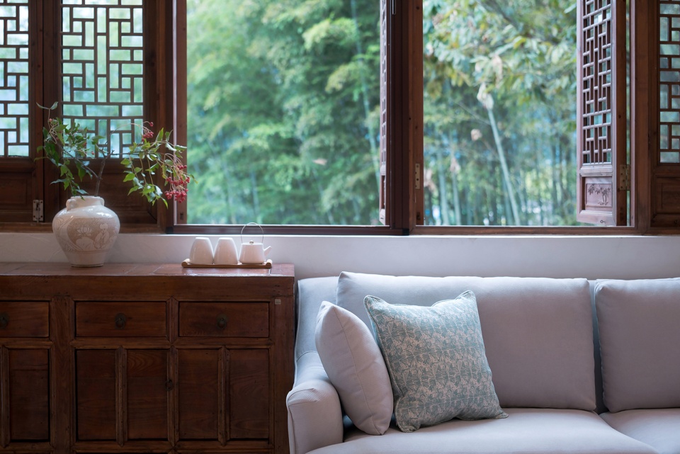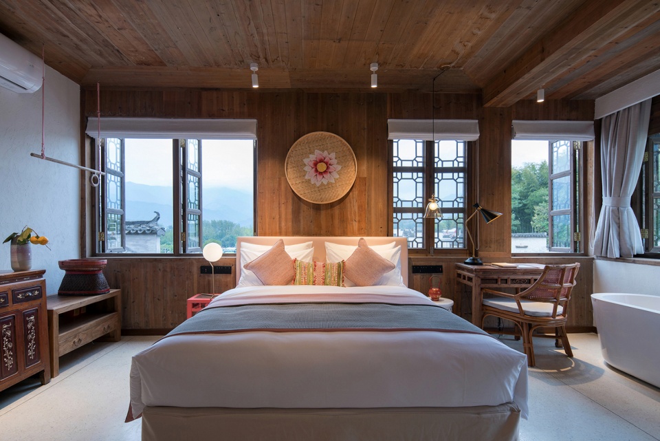 “青山绿水引诗赋,墨瓦白墙牵画魂。”以窗框为画框敞其观户外四季变换中的水墨宏村奇景,在不破坏建筑外观的同时设计保留旧窗格元素对原窗进行扩宽及重设。室内保留部分老木质材料及裸露粗犷的木结构,让人感受岁月在其身上流逝的痕迹。