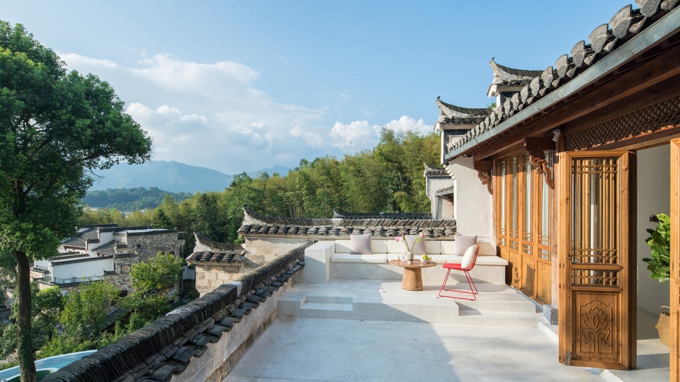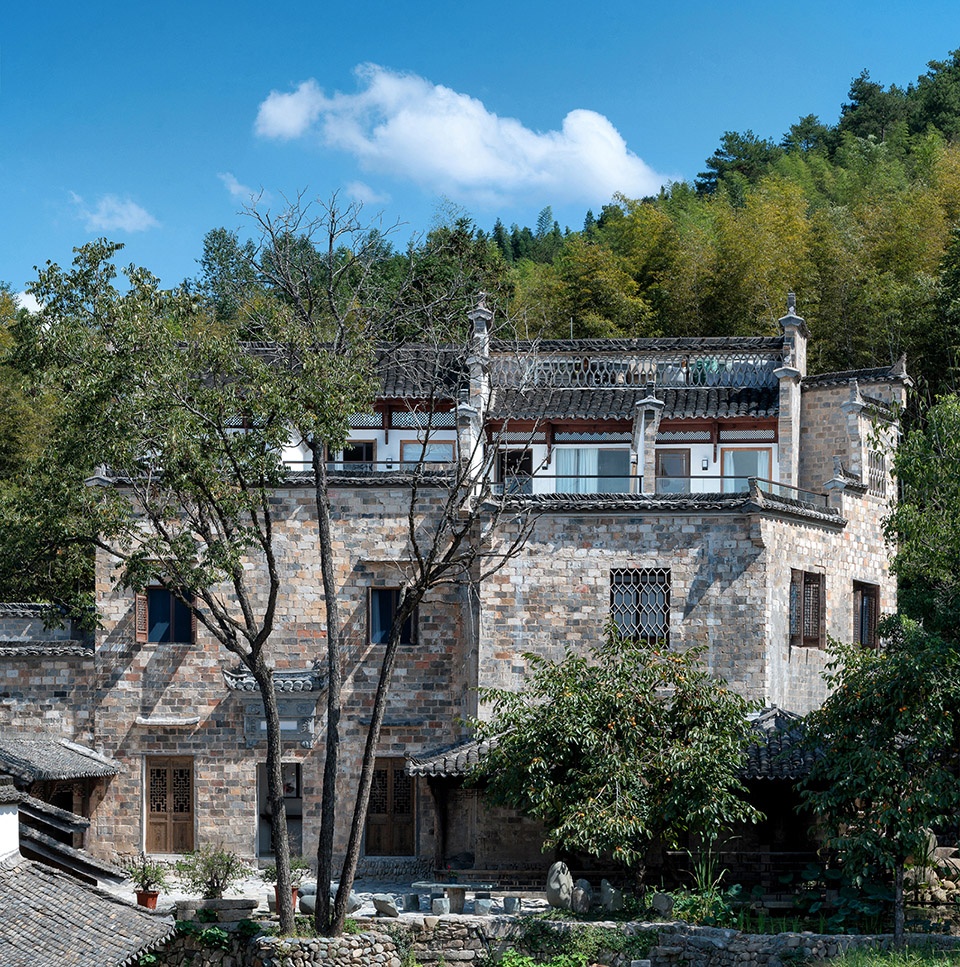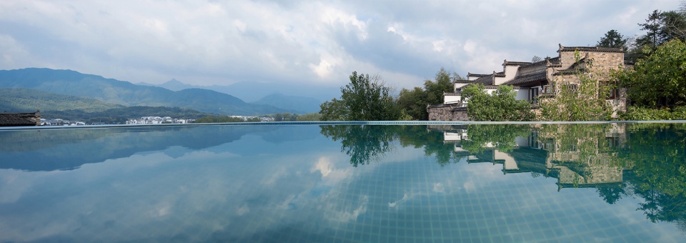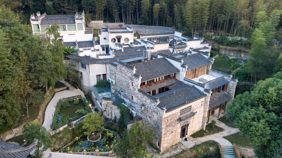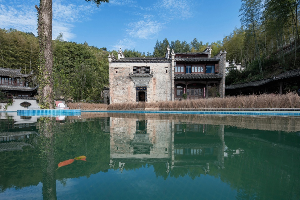 酒店由七栋不同时期建造的徽派建筑组成。建筑实施保护性修复,做到修旧如旧并保持徽派建筑独有的砖雕、石雕、木雕来做装饰。利用地理优势将山间小溪引流,经过酒店每栋建筑最终汇聚堂前形成一波清池。