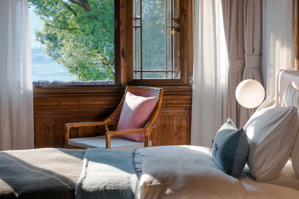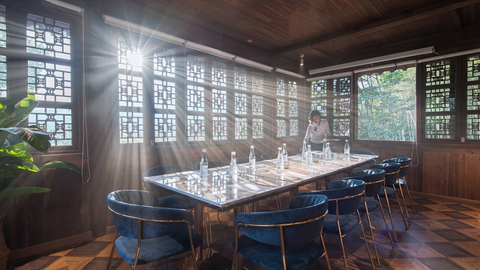 the meeting room of the hotel, the interior retains some of the old wooden materials and the exposed rough wooden structure, and scenery is provided through the window frame