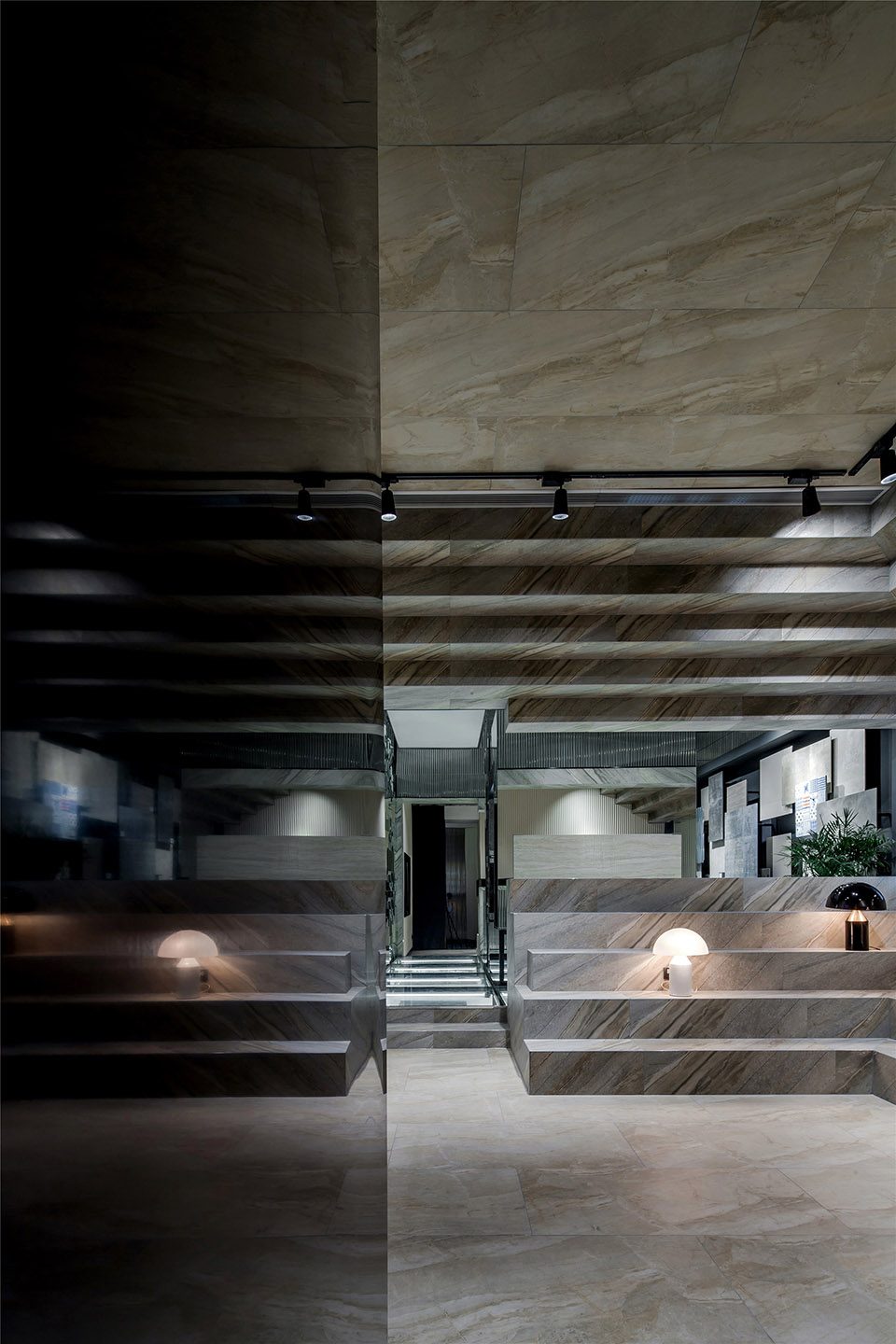 Clear light and shadow, reflect the reality. Ladder area provides several functions including communication and sharing between designers and suppliers, owners. Here, discarding the design method that the glass mirror stretch levels, using a same material for the ceiling and floor, providing an interactive space. Different forms of three dimensional composition allow the display function bring into full play.