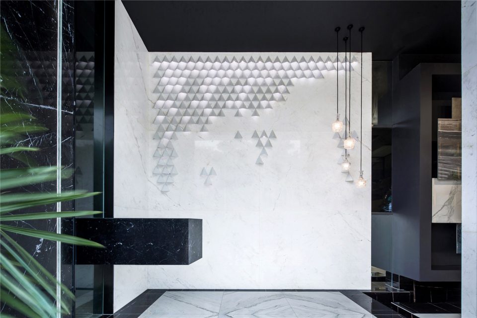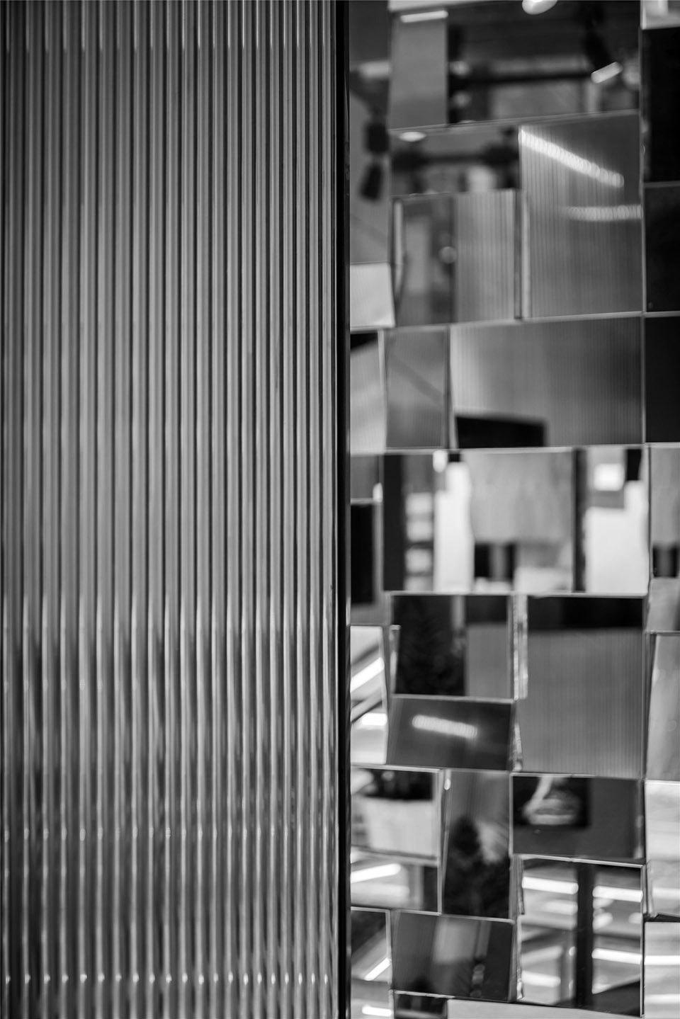 Turned to look back, geometry facade reciprocates with the light and mirror elements, creates a clear and calm atmosphere. The mirror glass on the ceiling will stretch out the time and space to the three-dimensional space, the multi-level expression of pattern and design language is exquisite.