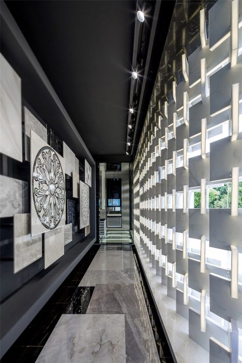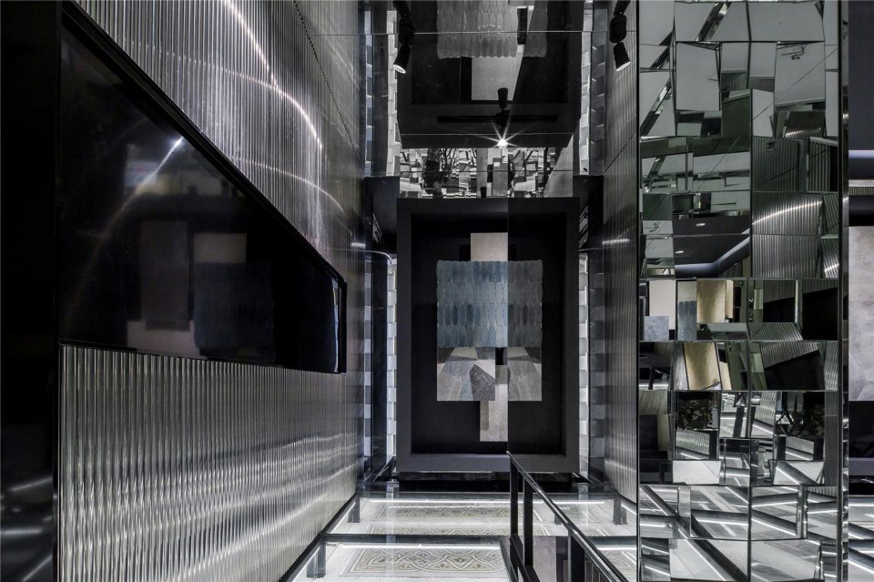 The spatial experience is formed by the combination of color interwoven, material collocation, and spatial geometric language. It shows the space of its own calm, clear temperament characteristics, and provides excellent fit point for the cold gray tone. Arraying and paving geometric shapes, forming a refreshing, rational museum experience atmosphere with a dark cool tone. Geometry represents reason and order, in different paving applications, it will show a very different experience to pass. The geometric patterns from vertical slender convey calm, order and quiet feeling, but the geometric design from intertwined collage of the glass mirror, gives people a bizarre thinking-oriented and pulling out the infinite reverie.