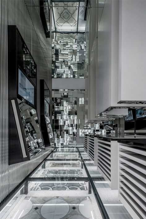 Here, the unique charm of the display comes from the sketches of the space temperament. Seemingly wantonly in order to stack the orderly glass, guide the intertwined and penetrating of the views, and its clear mirror reflection effect stretchs and amplification of the original space. Display items in the bizarre space-time transform to a more refined expression. Corresponding to the spatial temperament of the cylindrical stainless steel set, it brings a variety of refraction light. At the same time, the light forms a diffuse reflection, it also gives the magnificent changes to the space. On the side wall, vertical metal grains represent the absolute rationality and order; the combination of stainless steel and black mirror, leads to the philosophic metaphor about black and white, the chaos and clear.