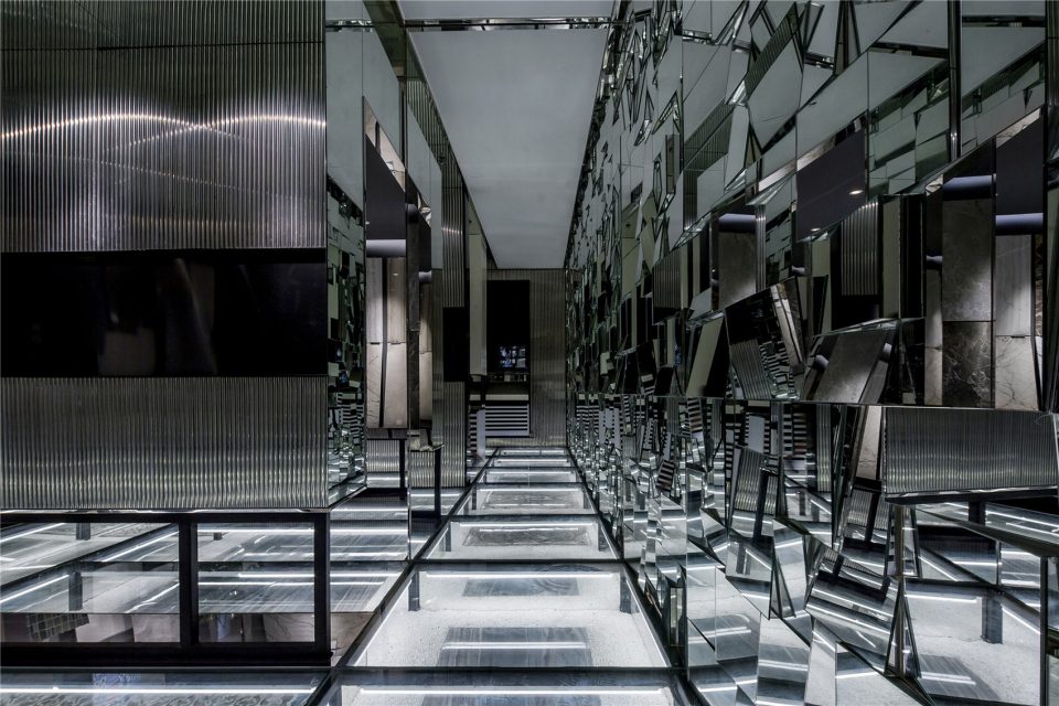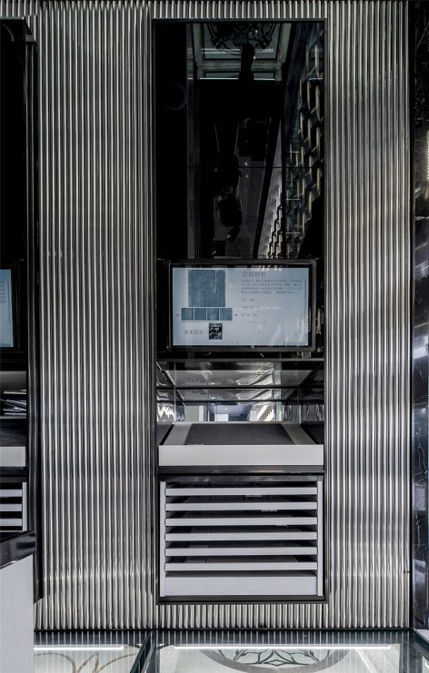 在这里,展示物的独特魅力来自于其所属空间气质的勾勒侵染。看似肆意妄为实则层叠有序的玻璃,引导视线的交织与穿透性,其清晰的镜面反射效果将原有空间进行平行时空的拉伸和放大化。展示物品在光怪陆离的时空变换中体现得更为精美绝伦。相对应空间气质的圆柱不锈钢设定,带来多样化的折射灯光,在灯光形成漫反射的同时,亦赋予空间多彩瑰丽的变化。身侧的一面高墙,竖向金属纹路代表绝对的理性和秩序,其不锈钢和黑色镜面的配合,导引出纤细与质朴、明亮与黑暗的对比;黑与白、混沌与清澈的哲学隐喻思考。