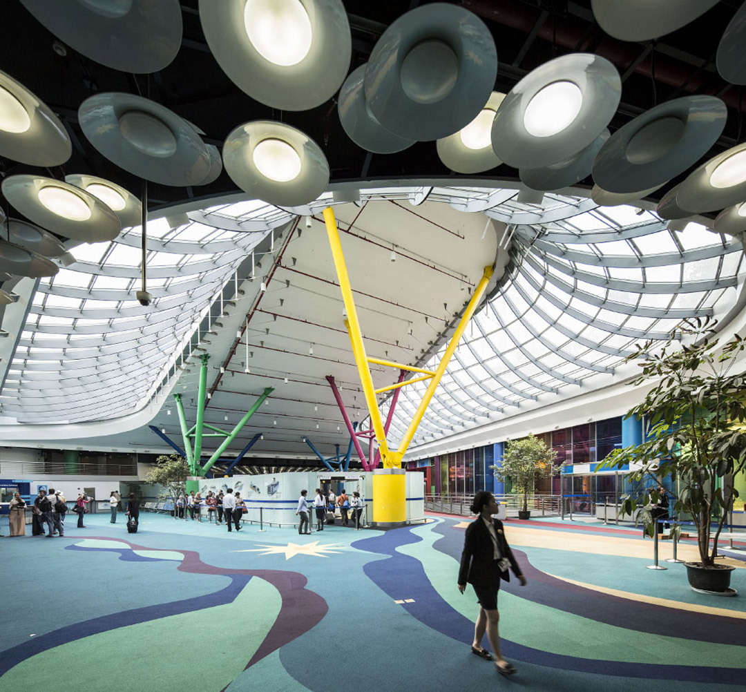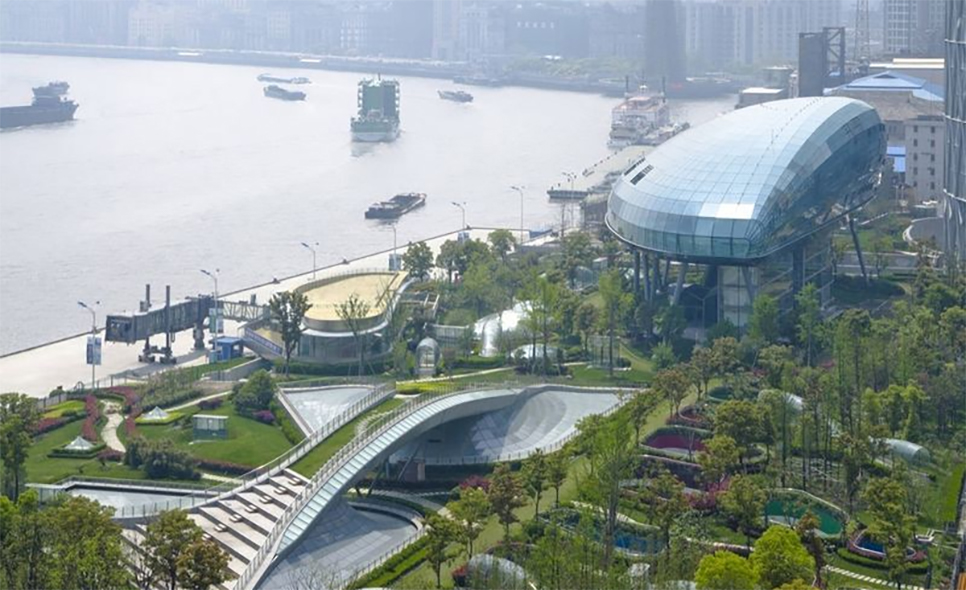 Shanghai Port International Passenger Transport Center is located in the central area of Huangpu River. The base is 850 m long along the river, with a total construction area of 400,000 square meters, including 12 international passenger station, apartment hotel, office building, art gallery, underground commercial pedestrian street, culture and leisure buildings. The total construction area of the basement is 240,000 square meters, with 3 floors, underground 3 floors and underground 2 floors are parking, equipment room, underground 1 floor with passenger transport, office, conference, business, leisure and other functional areas. The total construction area of the ground is 160,000 square meters, the ground buildings are high-rise, the highest is 100 square meters. The transportation center is designed according to the requirements of the fourth generation of international cruise home port. The dock can dock 3 large Menghua cruise ships at the same time, and the passenger station can accommodate 2,000 people at the same time. It consists of an underground waiting area, a joint inspection hall, a baggage claim area and an above-ground sightseeing waiting building, which is an irregular glass sphere with unique shape that "floats" on the green belt.