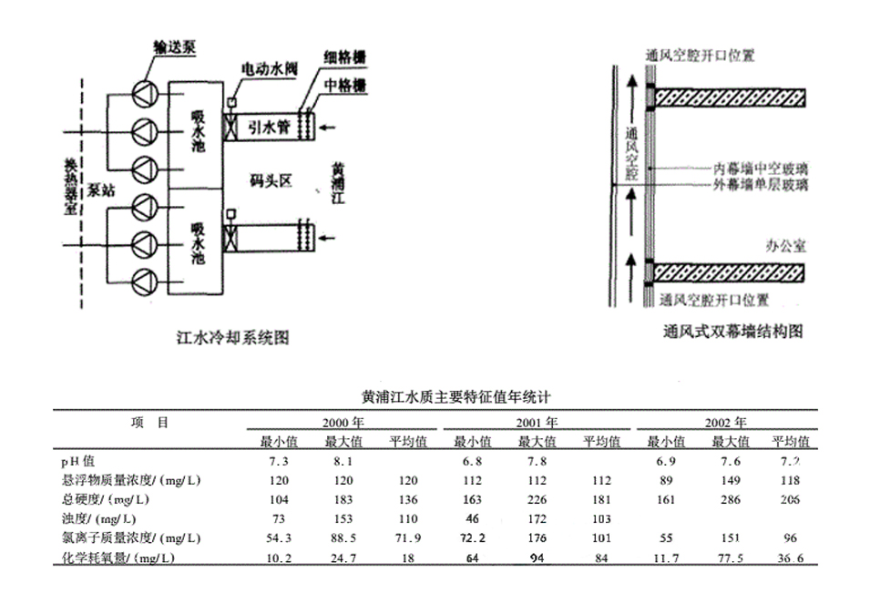 空调冷热源采用江水方式的优势:传统冷却方式一般采用冷却塔冷却,冷却塔体型较大,影响建筑的布置及视觉效果,噪声一般在65dB以上,并且冷却塔漂水可能传播军团菌,影响卫生条件。采用江水冷却可降低噪声的污染,改善建筑视觉效果,无卫生问题之忧,并且根据水文站资料,江水温度一般不高于30℃,与冷却塔冷却方式相比,冷水机组冷却水进水温度低,运行效率高,冷水机组耗电量可节约10%以上。根据历年水文资料,黄浦江江水冬季温度在4~8℃之间,可采用水源热泵机组代替热水锅炉供暖,热泵机组COP可达到4.0左右,一次能源利用率约1.2左右,比燃油(气)锅炉高30%以上。