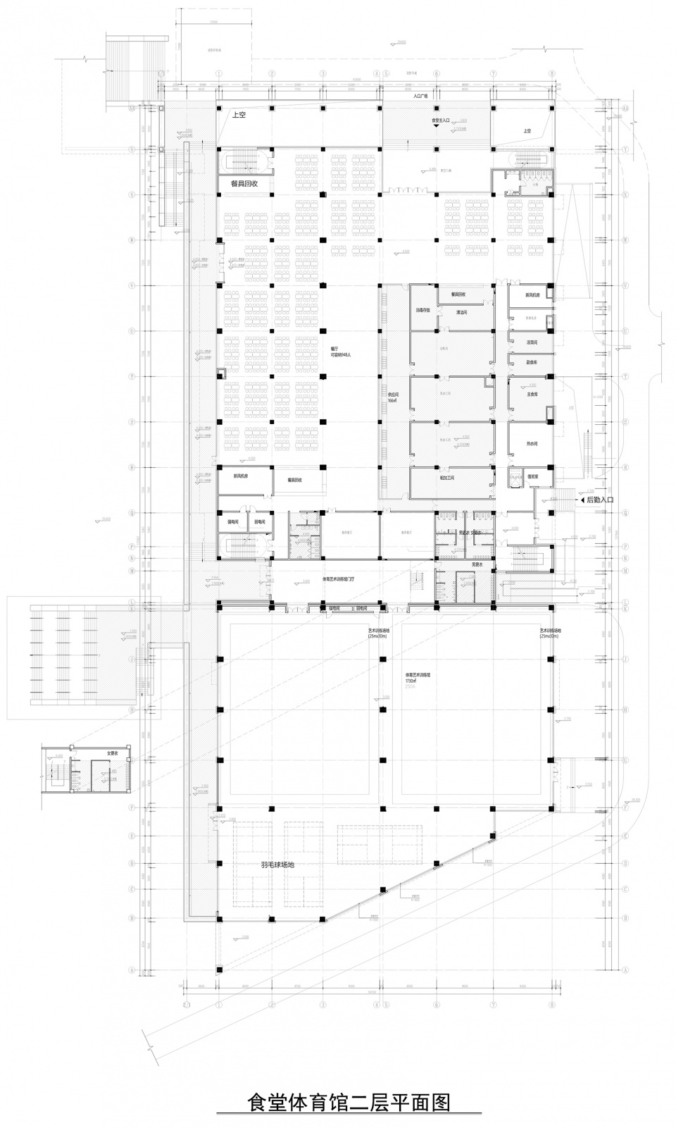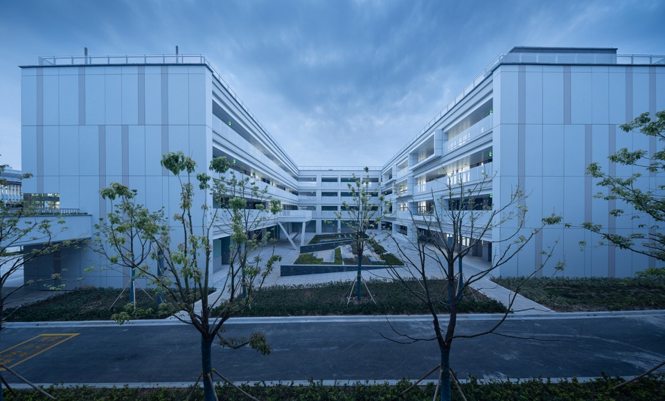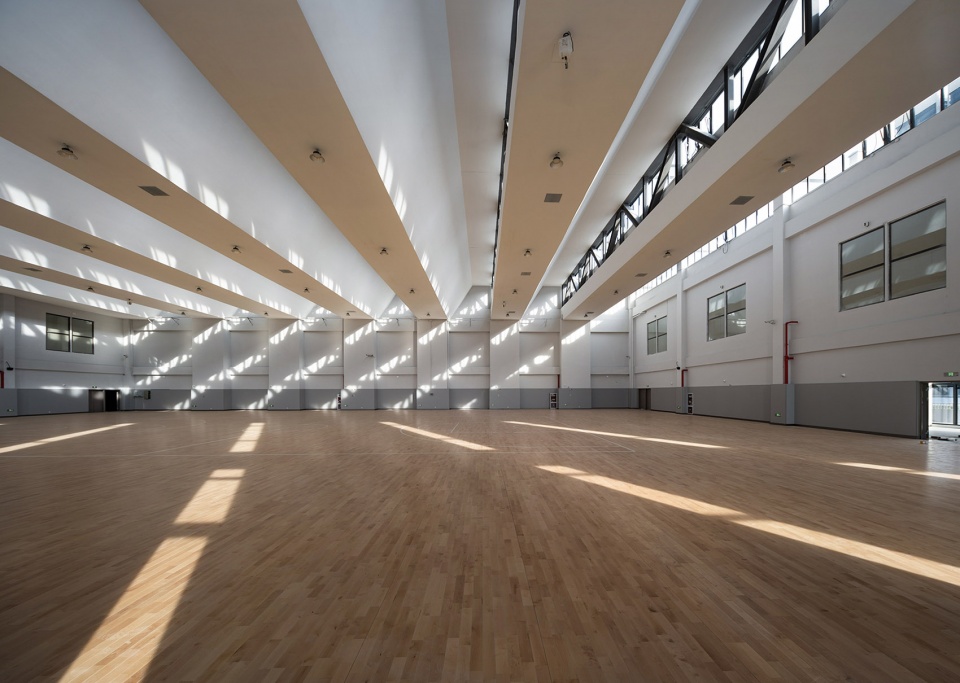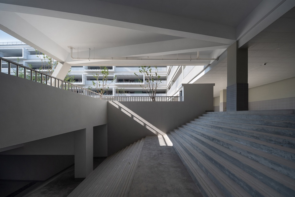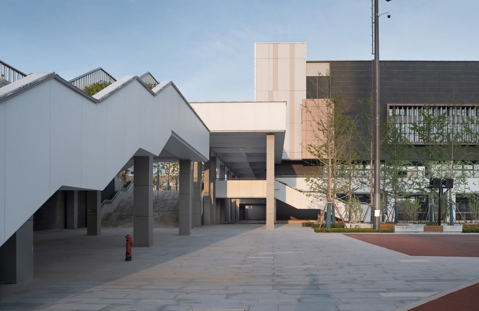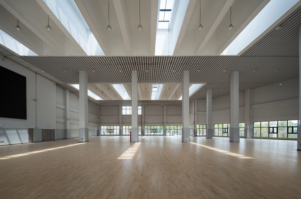 (2)West: The teaching building is located in the northwest corner of the west campus, which is divided into three parallel buildings arranged on one side according to the grade, and each building holds 20 ordinary classrooms. These three buildings are connected by a shared corridor, and the teacher’s office is located on each floor by the corridor, facilitating the communication between teachers and students. The administration building is located at the central axis of the west area, echoing the tower from afar, and commanding the school. Its facade adopts dry hanging grey brick curtain wall, echoing the architectural style of the old campus. The first and second floors of the canteen & gymnasium are canteens, which can accommodate about 2000 teachers and students to have meals at the same time. The third floor is gymnasium and art training hall. The runway is placed in the building, and the skylight can meet the indoor lighting needs.