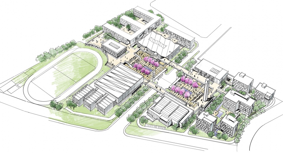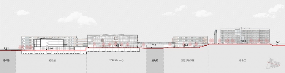 为了缝合被城市道路分开的东西两个校区,提高师生效率,该设计用南北两道天桥将学习中心、体育馆、食堂和大礼堂串联形成一个“知识之环”,从而学校中使用率最高的重要建筑被紧密地串联在了一个二层环路上。围合的环路构成“中央公园”:东西两个校区的入口广场相对,拼合成校园最核心的开放空间。东西向的礼仪轴两端分别树立行政楼和钟塔,作为轴线的收束点。设计充分利用场地高差,减少土方外运量的同时,营造立体化的绿性态校园景观。