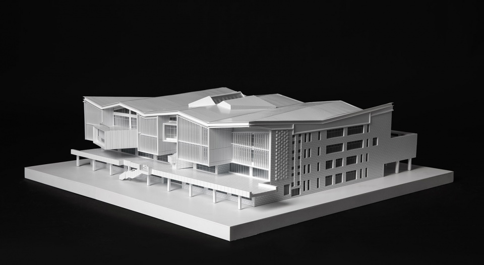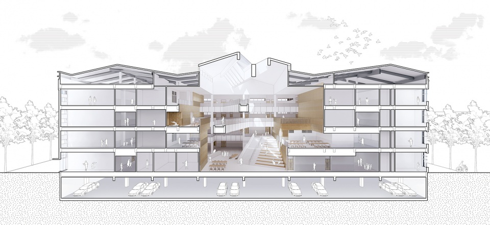 在STREAM学习中心的外部,通过功能房间的挑出以及旋转,形成活泼的外部界面以及供学生们交流活动的连廊、平台、灰空间等,其与外部环境的相互对话,成为学生课间活动的室外场所,方便其课间的场所转换。建筑师以“SRTEAM 学习中心”的机制,通过内外功能空间的柔性过渡,实现学科交叉教育以及预期交往行为触发等非正式学习,探索“SRTEAM”教育模式下教学功能的组合以及触发学生交流行为的多元复合空间模式。