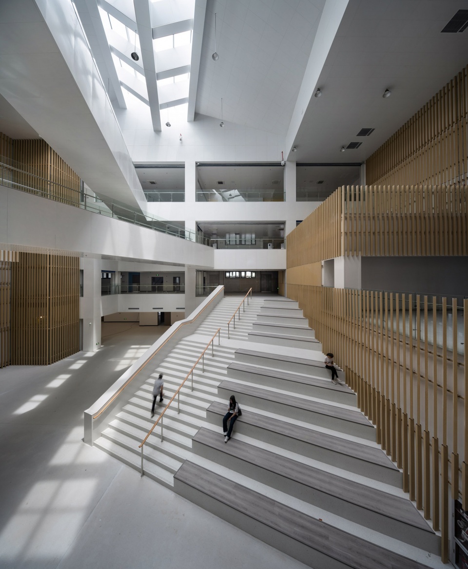 屋顶的天窗提供了天光,使得视线的联系和光线的串联成为一种时空的魔法,获得流线上某种探知的欲望。天窗之下是一部从一层连接到二层扩展平台及阅览室的公共台阶以及三四层平面的天桥,宽窄收缩变化的台阶成为学生课间阅读、交流及STEAM成果的展陈与演出空间。如此,各种的功能房间通过中庭、连廊和多重平台拓展了房间的维度,组织成垂直的立体活动空间,给学生交流和研学活动提供了一个复合的多元化场所。