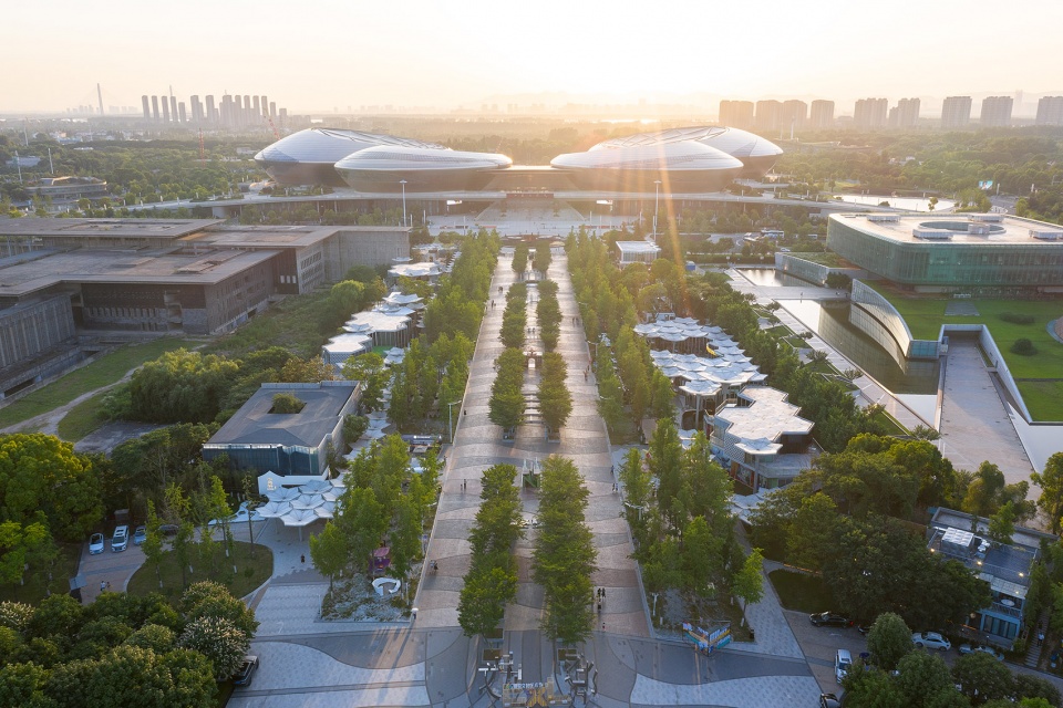 The project is located in the western section of Hexi Culture and Sports Axis in Nanjing, connecting Jiangsu Grand Theater in the west, Jinling Library in the north, Olympic Sports Center across Leshan Road in the east and Yilanzhai Art Museum in the south. The southwest corner of the plot is the Olympic Sports Center Station of Metro Line 10. The current planning status is green space, and some original hard land in the site is used as its construction land. The area to be optimized and updated is about 330 meters long, 100 meters wide and 19400 square meters, connecting the original central square and garden of several major public buildings. The project is a service-oriented commercial building, which serves as the supporting service facilities of the landscape park. At the same time, it serves as a corridor to connect Leshan Road square and the Grand Theater, coping with the inconvenience of walking in rainy and snowy weather. The total area of the building is about 3000 square meters.