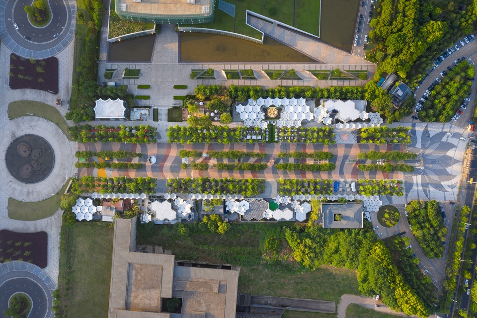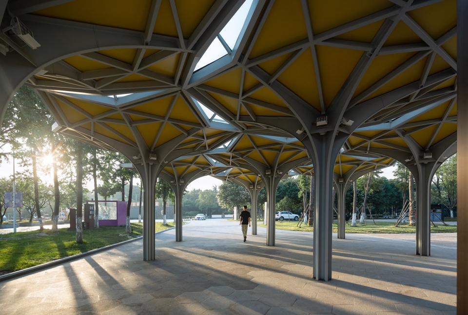 From the current situation of the site, the large number of rows of ginkgo and cherry trees planted in the square have become quite large due to time. As a supporting new block, it must serve as a foil. All designs adopt the intention of “flower sea under the woods” to echo the site and the important cultural buildings around. The design firstly determines the hexagon as the basic form, because the hexagon is easy to combine in all directions. Then it is cut and deformed, and finally the intention of abstract “flower” is formed. The “flower” is supported by an umbrella shaped thin-walled steel structure and opens in six directions. Through the division and arrangement of structural members and auxiliary members, a basic unit with aesthetic feeling is formed. The unit is highly matched with the function and structure, coupled with the application of color, can lay a good foundation for the rich changes of cultural blocks.