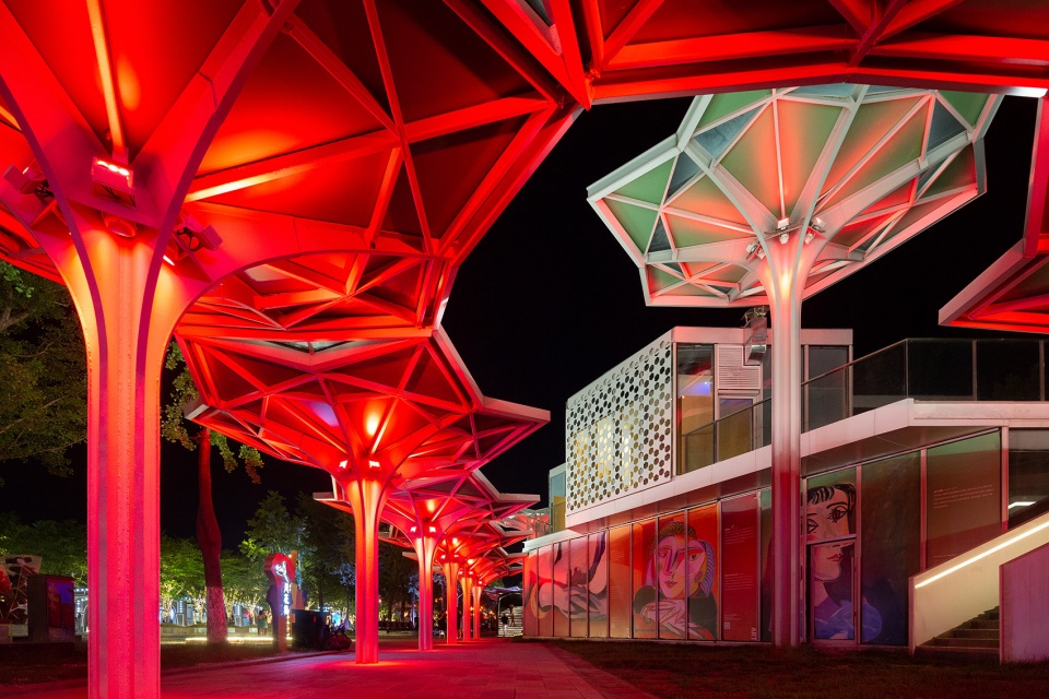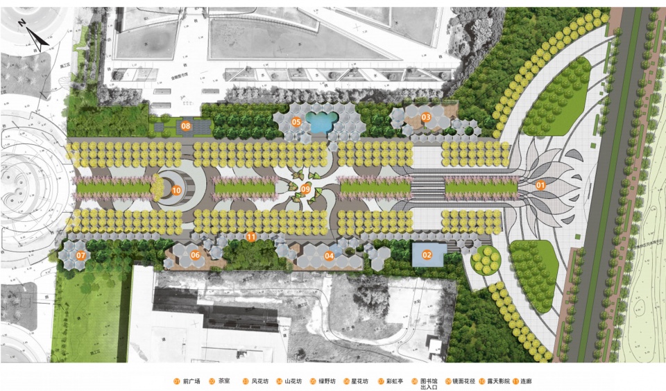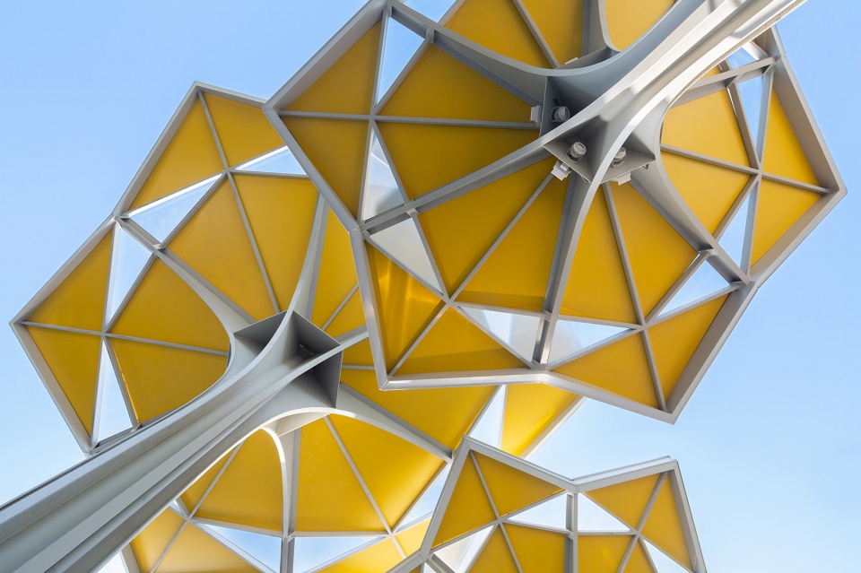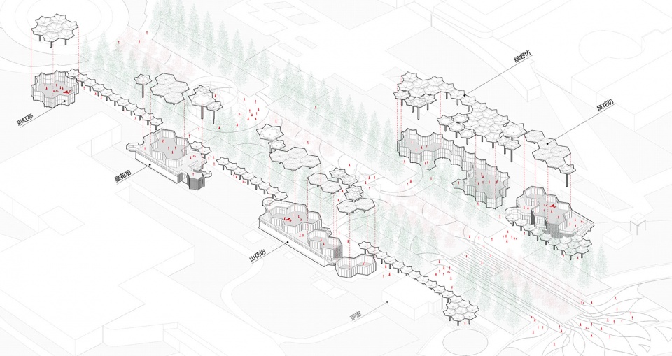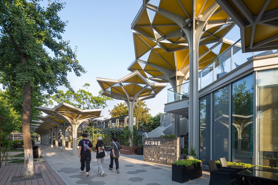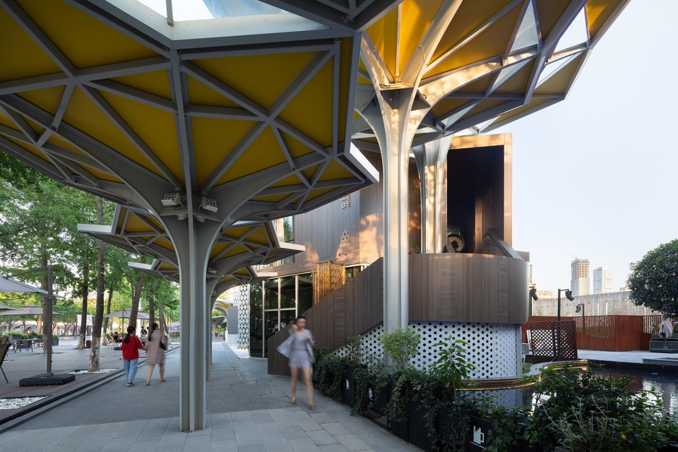 从场地现状来看,广场上大量种植的呈行列式状的银杏树和樱花树因为时间的原因都已颇具规模,作为配套的新建街区一定是陪衬和配角的姿态,所有设计采取“树林下的花海”意向来呼应场地及周边的重要的文化建筑。设计首先确定六边形为基本形态,这是因为六边形便于向各个方向进行组合。其后再对其进行切割和变形,最终形成抽象的“花”的意向,“花”以伞状的薄壁钢结构为支撑,向六个方向打开。通过结构杆件以及辅助杆件的划分和布置,形成具有美感的基本单元,单元同功能和结构高度匹配,加之色彩的运用,就为文化街区丰富的变化打下了良好的基础。