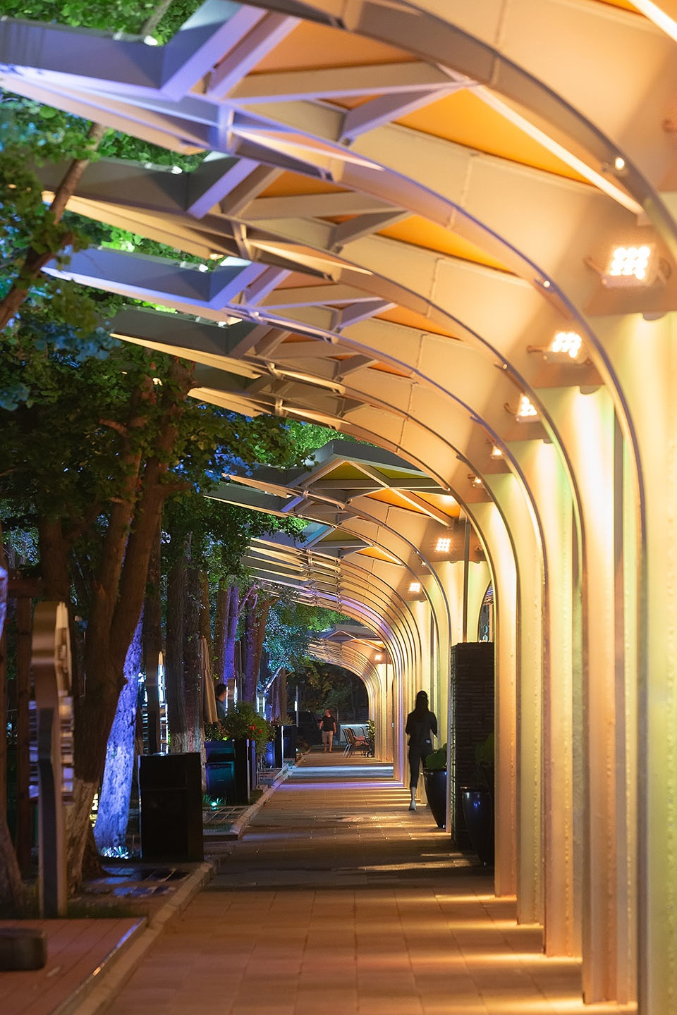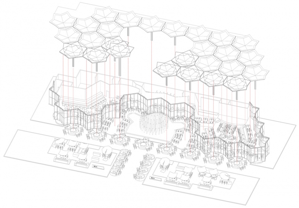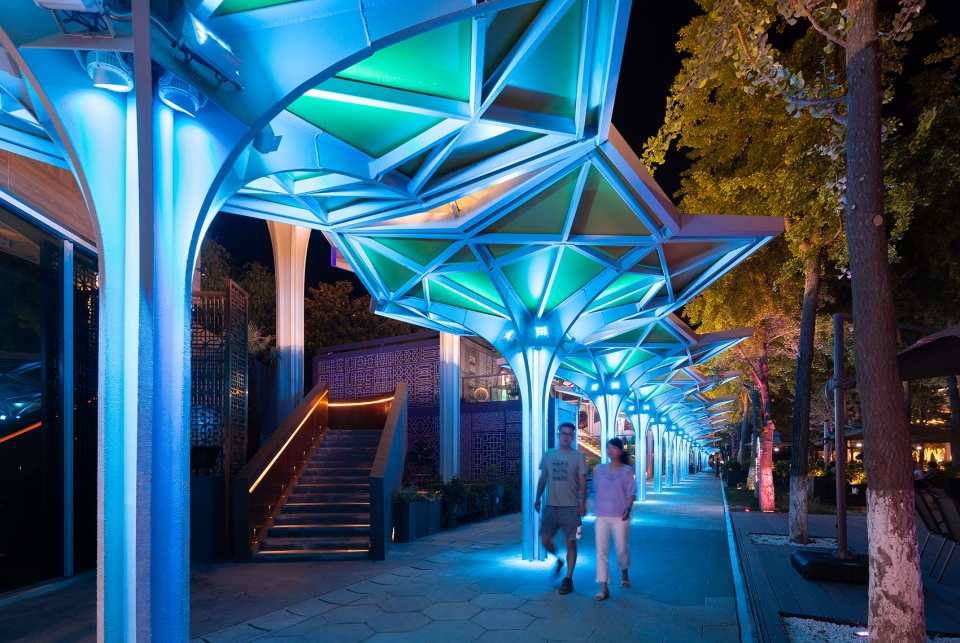 在基本单元确立的基础上,街区的生成根据功能由两部分组成。第一部分是连接乐山路广场和大剧院的风雨长廊。伞状单元因为是花瓣状,其连接处用棱形玻璃体过渡,形成长廊下丰富的光影空间。在广场入口处,单元可以围合组合成休息亭,而在具有商业功能的体块附近,伞状单元又在高度和跨度上进行合理放大,形成高低错落的组合形态。一者是让近三百多米长的廊道能在人行进的过程中有所变化,再者是对每组商业体的入口空间给予提示。同时这些放大单元又可以同室外的疏散楼梯结合起来,形成具有遮风避雨功能的景观性形态。这些变化的另外一个作用就是部分伞可以为商家提供外摆空间,这对于延伸商业需求,让室内外有更好的渗透都起到了非常积极的作用。