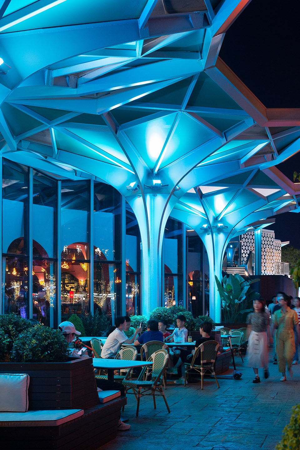 On the basis of the basic unit established, the generation of the block is composed of two parts according to the function. The first part is the corridor connecting Leshan Road Square and Grand Theater. As the umbrella-shaped unit is petal shaped, its connection is transitioned with prismatic glass, forming a rich light and shadow space under the corridor. At the entrance of the square, the units can be enclosed to form a rest pavilion, while near the commercial volume, the units can be reasonably enlarged in height and span to form a staggered appearance. Its function is to make the nearly 300-meter-long corridor change during people’s travel, and to give tips on the entrance space of each group of commercial entities. At the same time, these units can be combined with outdoor evacuation stairs to form a landscape form with wind and rain protection function. Another effect of these changes is that part of the umbrellas can provide outside space for businesses, which has played a very positive role in extending business needs and making indoor and outdoor penetration better.
