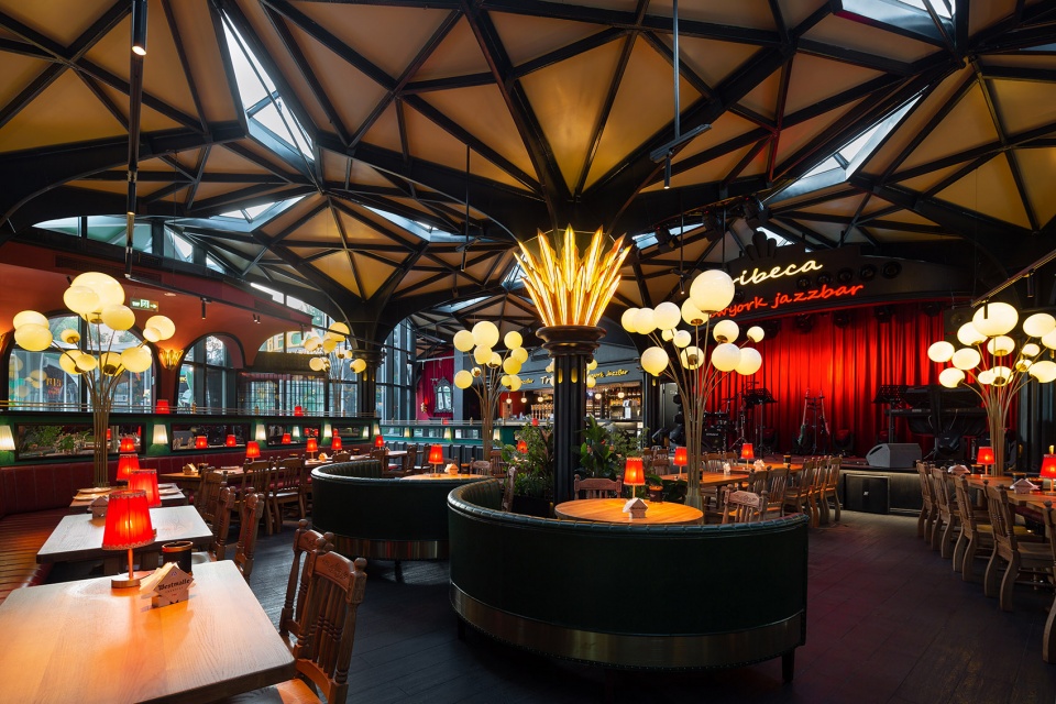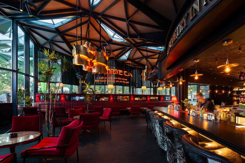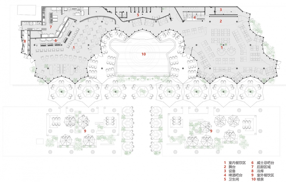 The second part is to combine the basic units into five commercial units with perimeter and climatic boundaries. They vary in volume and number of floors according to site size and commercial function, and are grouped in two ways. One is the combination of basic units and curtain wall enclosure. The two volumes of one-story buildings are treated in this way. The larger one was renovated into a restaurant bar, and the umbrella of the unit was basically intact in the interior. Prismatic skylights make the whole roof space very distinctive, and the order formed by the combination of units brings special beauty, which also makes the restaurant stand out, and this is the realm pursued by commercial space. The unique structural units undoubtedly play a positive role in it.