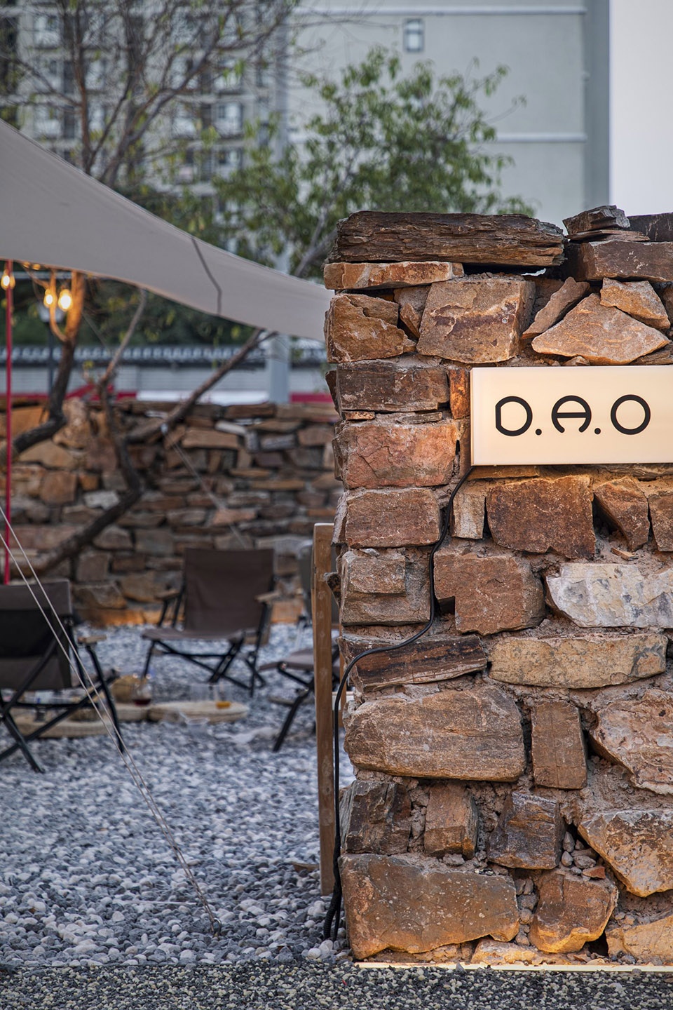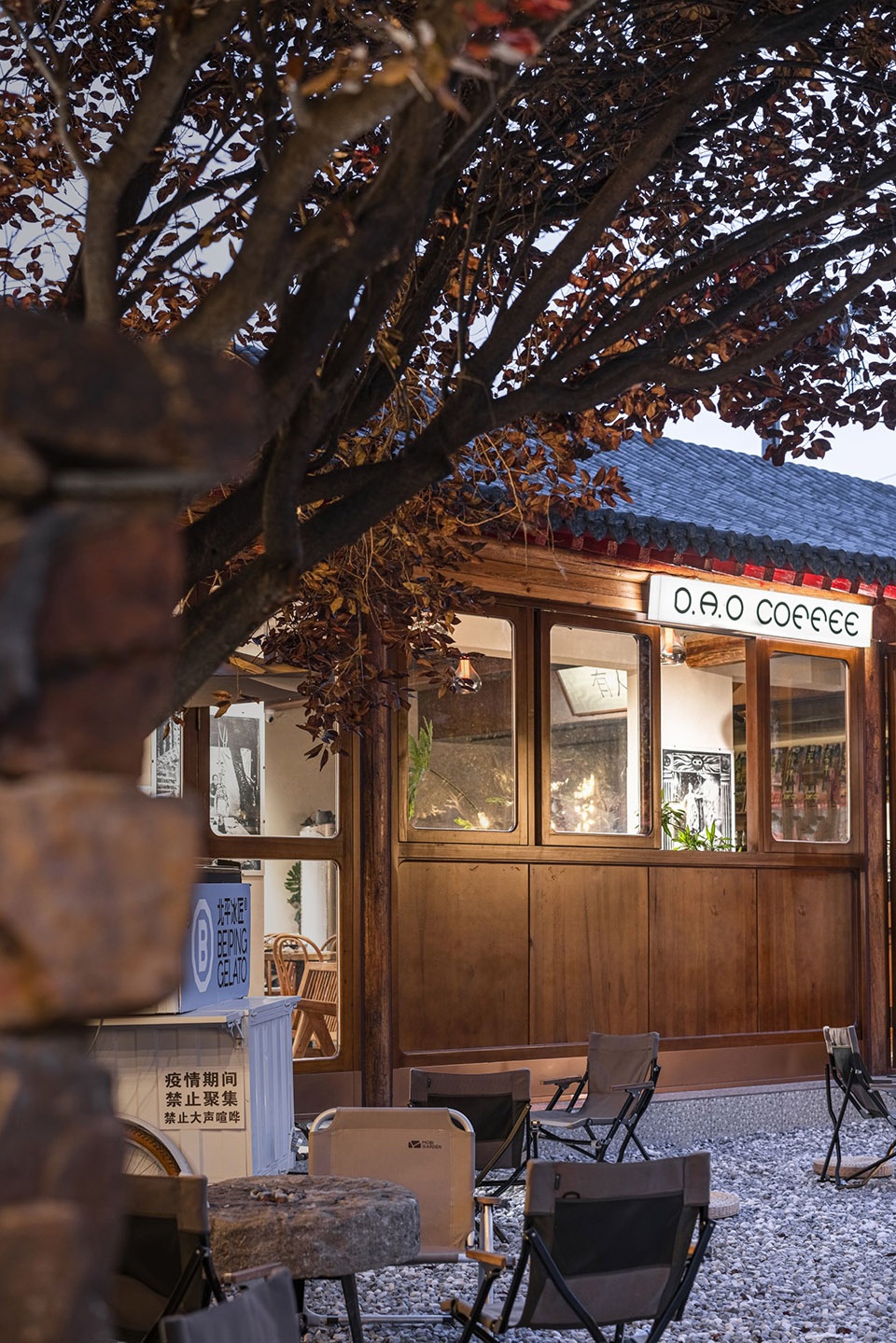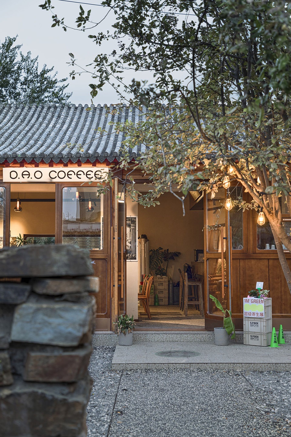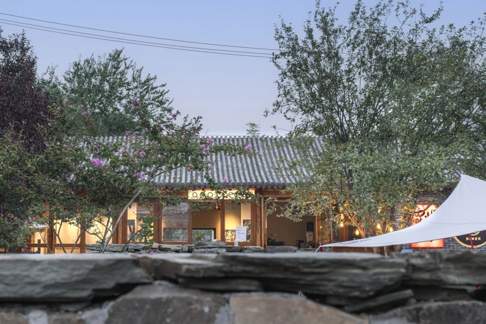 不同于一般咖啡馆开门见山的常规布局,多多洛村把四合院落改造成需要通过入口半矮石墙才能进入的围合空间。从外部看,只可窥见店内一小部分原野般的陈设。以入口处的石墙为界,空间内外是迥然不同的调性,多多洛村保留了原生场地中的绿植景观,延续这片土地的原始肌理,从改造到新建,都由团队和工人一起协力完成。