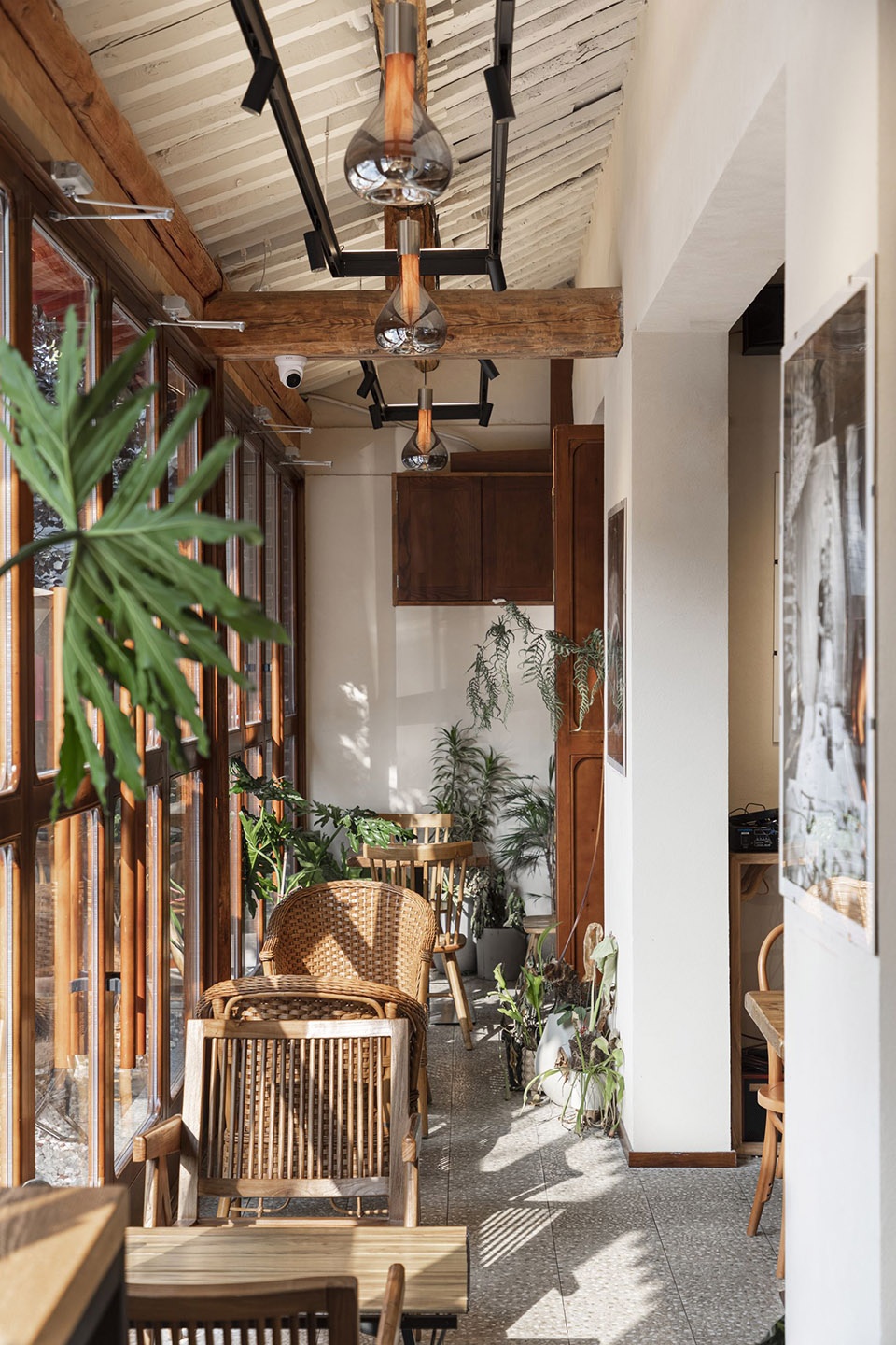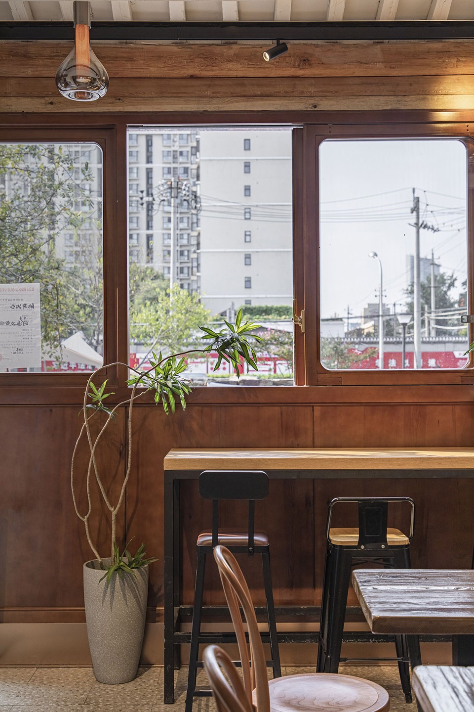 不同木材的颜色与纹理和白色的柱、墙面、天花以及金属酒柜形成和谐的反差。吧台内侧的木架里是储藏咖啡豆、陈年老酒及其他杂物的空间。房间西侧的高窗使空间沐浴在自然光下。随处可见野蛮生长的景观植物巧妙地把原本一览无余的空间进行了分隔,形成更加多变的咖啡体验空间。赋予了原本规则的建筑新的视觉焦点,激发客人进入探寻的好奇心。
