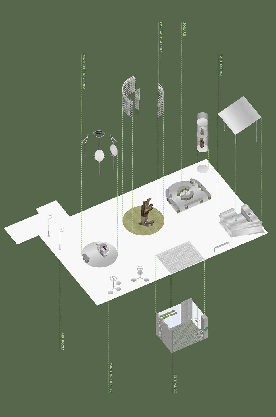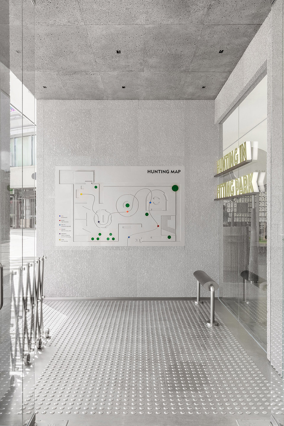 「 穿搭 」之旅由一张入口的地图展开,依照地图的路线分布,内部空间以:入口,凉亭取水站, 休憩广场,手稿画廊,魔镜穿搭区,展示区,VIP室为主。 在入口的设计上,借用了内退的距离创造了一个半户外的休憩空间,提供给大众在此处歇脚, 聊天,避雨,等候,打发时间…它的多重功能回应了城市居民所需,而非营造产生距离感的 商业空间。