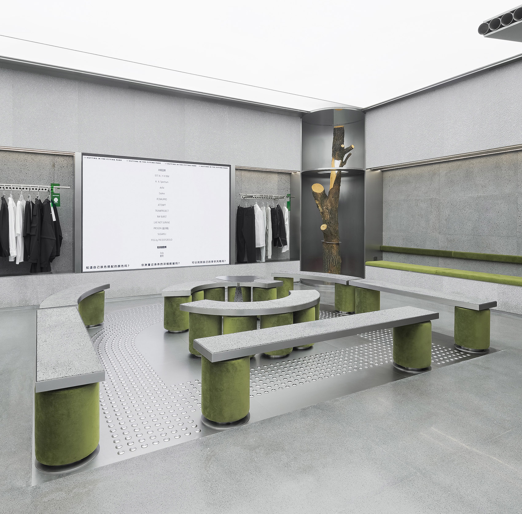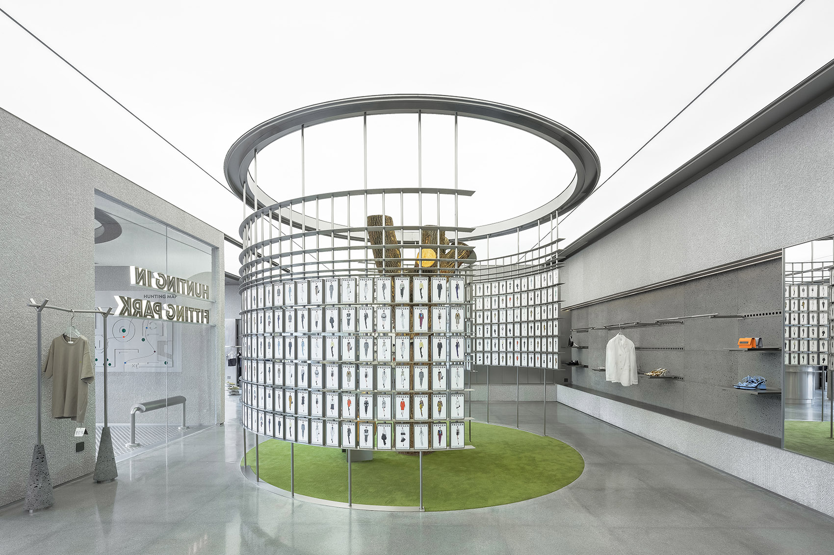 Progenius Park is more like an public urban space for contemporary younger to play. They can freely explore through different functions, like seeking for a favorite sketch, carved stone tells the details of the body measurement on the wall; the hidden suit, etc…There is no sense of distance, and it is a bit more fun when consumers “hunting”clothes or accessories here. At the same time, it brings fresh blood and vitality to the whole commercial block.