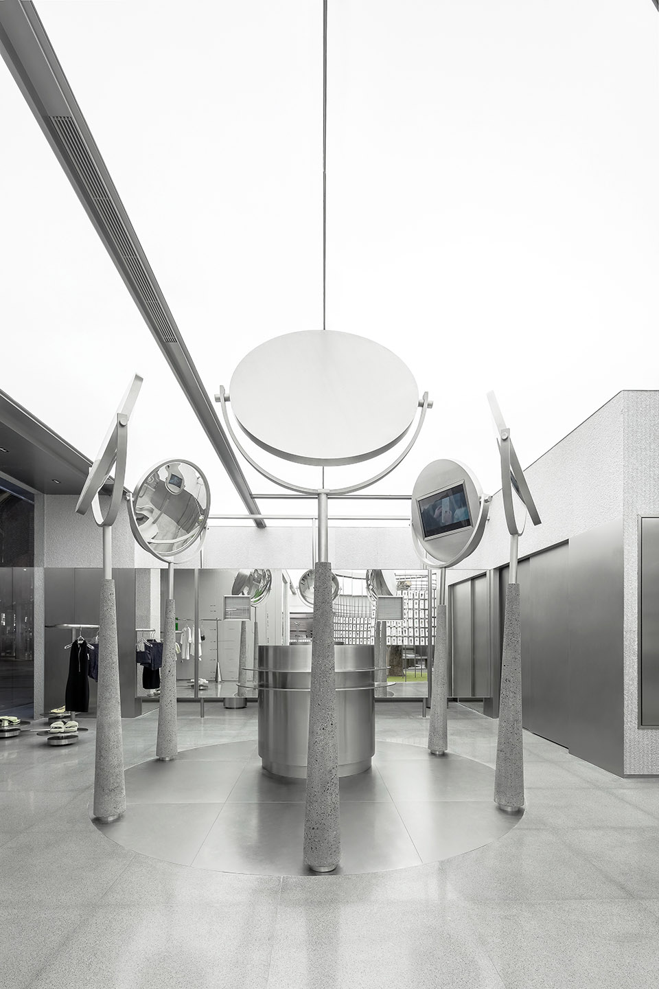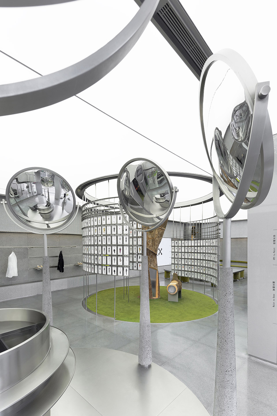 Magic Fitting area served by stylist, the Greater Dog Architects borrow the public facilities that appear on the street to create a fantasy land with five convex mirrors. A series of professional “styling” services such as skin test, body measurement,fitting,styling suggestion and it all happens here. Furthermore, VIP room provides a more private space to communicate.
