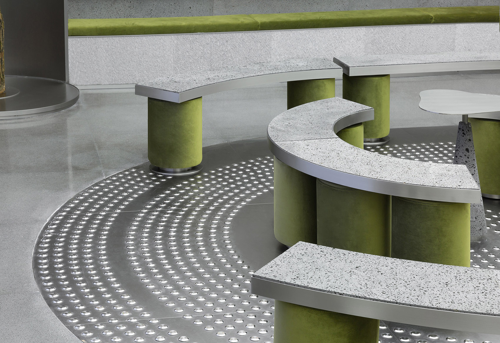 广场作为城市必备的公共场所,是市民进行交流,沟通,小憩,聚集等活动的重要场所。粗糙质地的洞石作为大自然的馈赠,拙感中带有天然的呼吸感。在「 PROGEN 理型公园 」 的休憩广场里,盲道钉,洞石,绿色绒布的运用,强化了户外与自然气息。 半围合的石凳摆放方式,带来不同群体或个人之间社交的可能性,更多的专业内容如:沙龙,设计品牌分享会也将在此处发生。