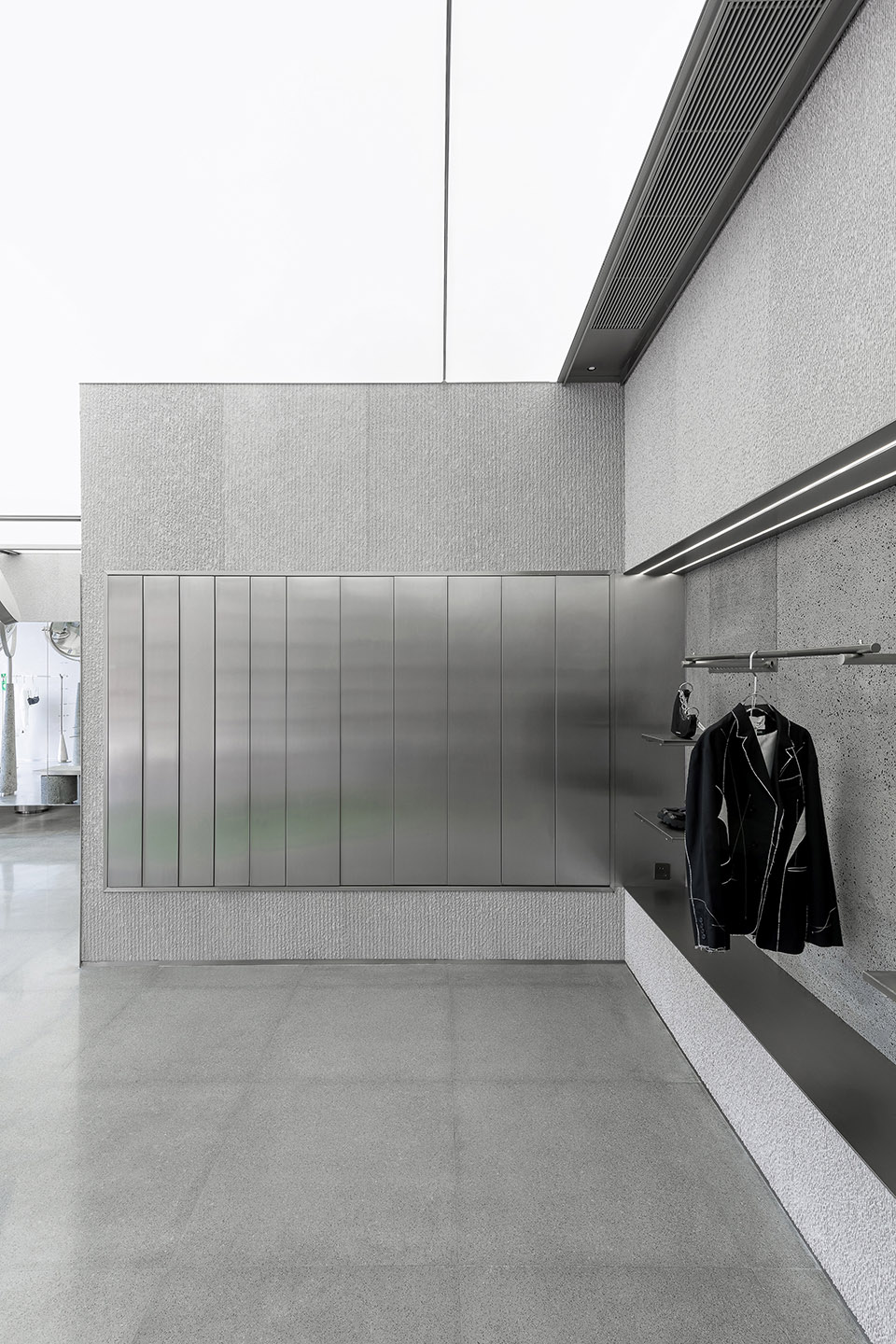 通过不同功能的设置,让顾客自由的探索其中:找到自己喜欢的手稿,刻在墙上的量体细节, 液压式的套装隐形高柜…它更像是一个符合当代年轻人玩耍的城市空间,没有距离感,多了几分在空间里寻觅的趣味,同时为整个商业街区带来新鲜血液与活力。